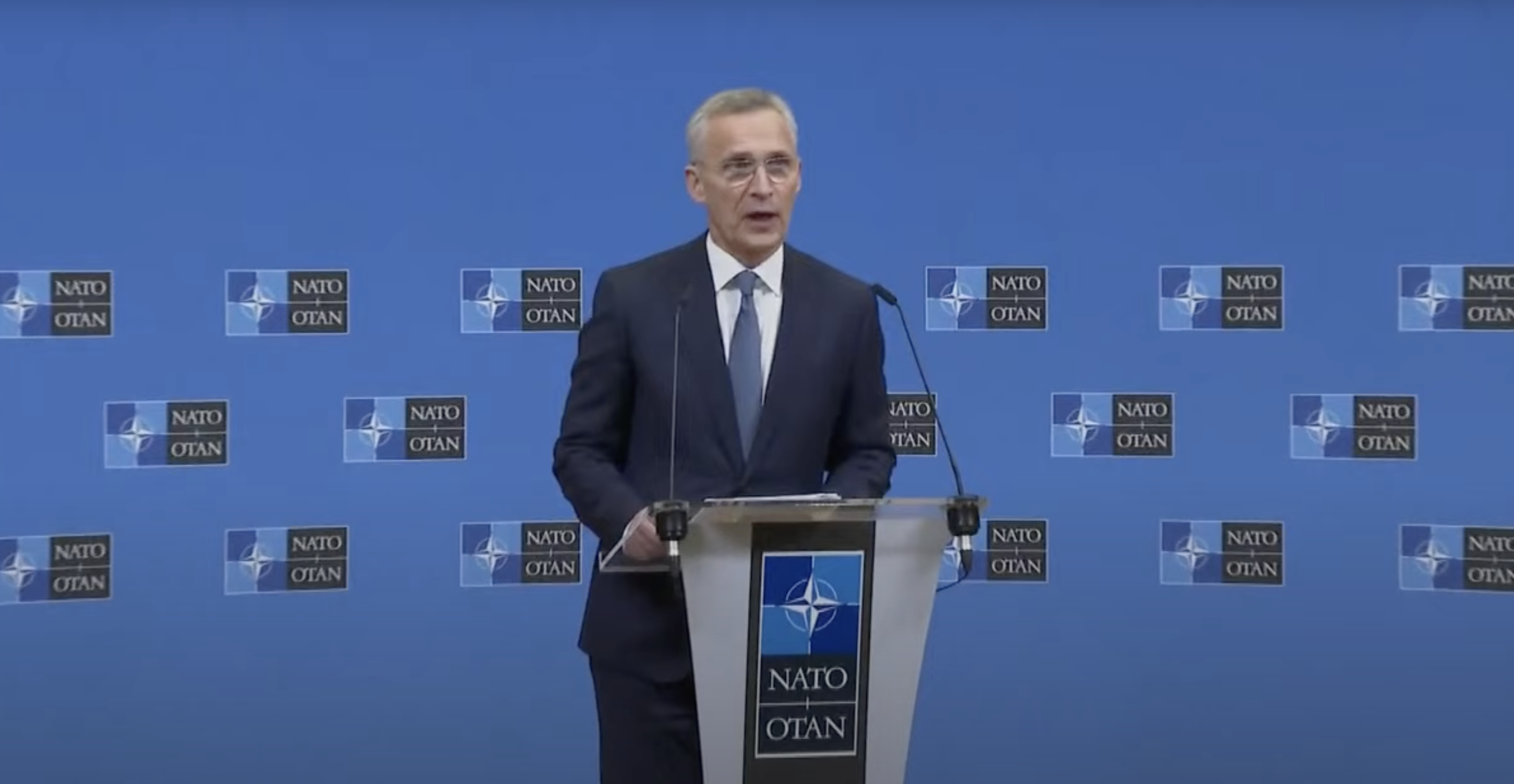 Jens Stoltenberg, secretaris-generaal van de NAVO tijdens een persconferentie gisteren n.a.v. 75 jaar NAVO (screenshot)