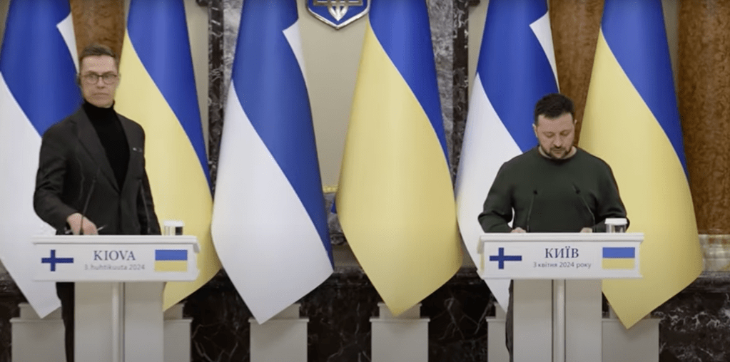 Gezamenlijke persconferentie gisteren van president Zelensky en zijn Finse ambtsgenoot Alexander Stubb (1968), die sinds 1 maart dit jaar in functie is(screenshot)