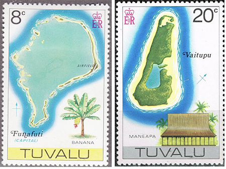 Twee postzegels uit 1978, links Funafuti, rechts Vaitupu
