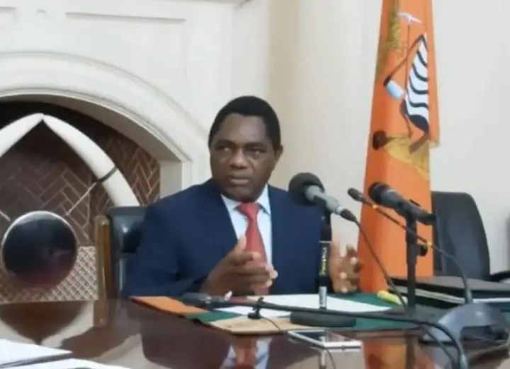 President Hakainde Hichilema (1962) geflankeerd door de presidentiële vlag (screenshot)