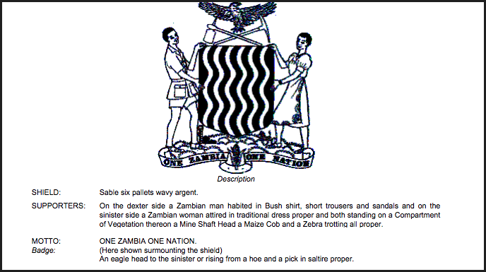 Twee elementen zagen we eerder op zowel wapen als vlag van Noord-Rhodesië, de ‘voorloper’ ‘van Zambia: de Afrikaanse zeearend (eveneens op de nationale vlag) en het schild met de zwart-witte zigzaglijnen, symbool voor de Victoria-watervallen en de Zambezi Rivier, waar Zambia zijn naam aan ontleent.