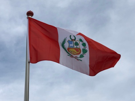 De Peruaanse vlag is een verticale driekleur in rood, wit, rood. In het midden van de witte baan is het staatswapen geplaatst. De kleuren komen van generaal José de San Martín zelf: toen hij in 1820 in een gevecht met de Spanjaarden een vlucht flamingo’s over zag vliegen met witte borst en rode vleugeltippen, riep hij (volgens de overlevering althans): “Zie, dat is de vlag van de vrijheid!”.