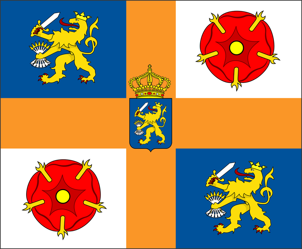 Persoonlijke standaard (verleend in 1937) van prins Bernhard van Lippe-Biesterfekd (1911-2004), waarin we naast de Nederlandse leeuw ook de roos van Lippe kunnen herkennen