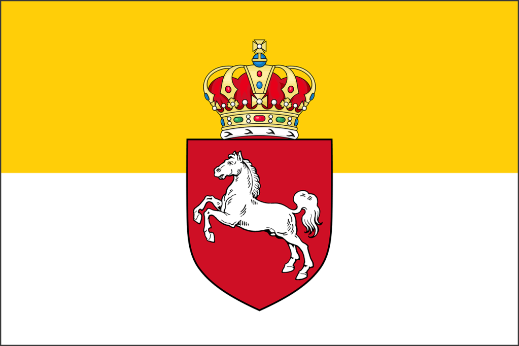 Vlag van het Koninkrijk Hannover waarop het wapen met het witte paard (1837-1866)