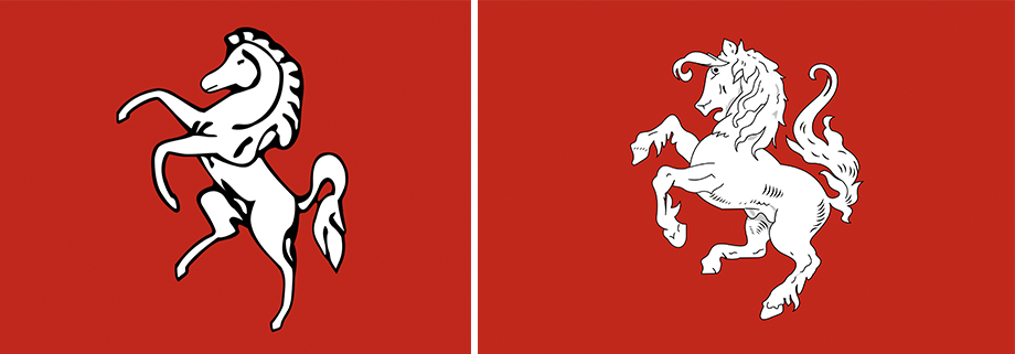 Daarnaast zien we ook witte paarden op de vlaggen het Britse graafschap Kent en van de Nederlandse regio Twente (hoewel dit historisch waarschijnlijk niet klopt).