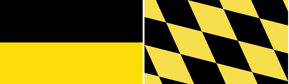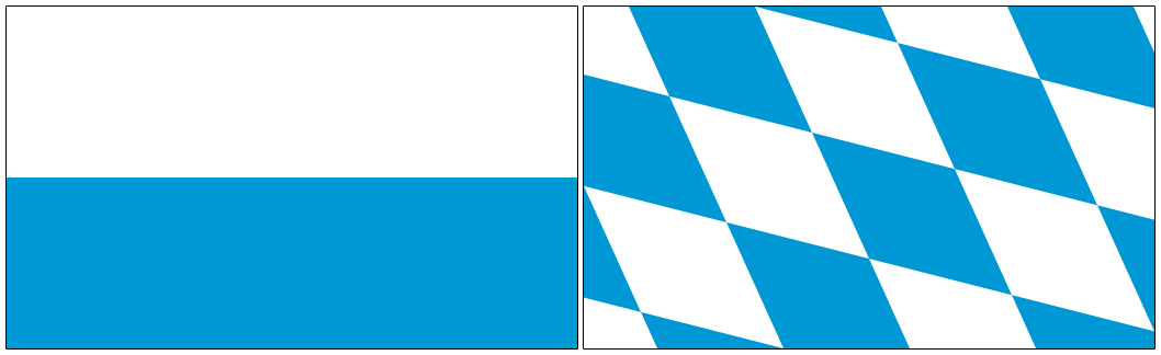 De twee officiële vlaggen van de Duitse deelstaat Beieren: links de horizontale tweekleur en rechts de iets populairdere ruitjesvlag