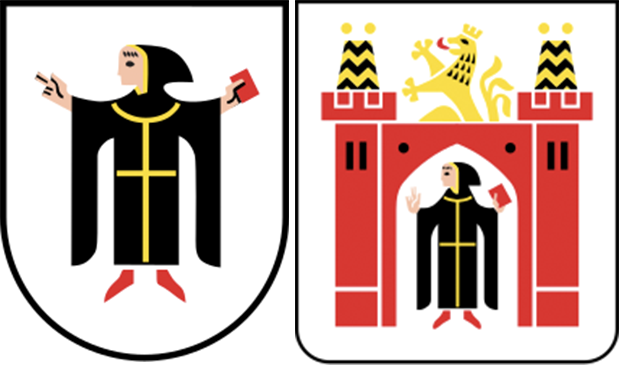 Toonde het hier boven afgebeelde stadszegel alleen het hoofd van een monnik onder een poort, vanaf 1304 wordt hij als volledige figuur afgebeeld. Hij draagt een met goud (geel) afgezette zwarte pij, rood schoeisel en een rood eedboek. Het kleine wapen laat alleen de monnik zien.