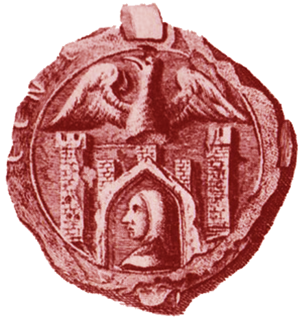 Het stadszegel van München uit 1268 met het hoofd van een monnik met kap onder een stadspoort met een adelaar erboven (publiek domein)