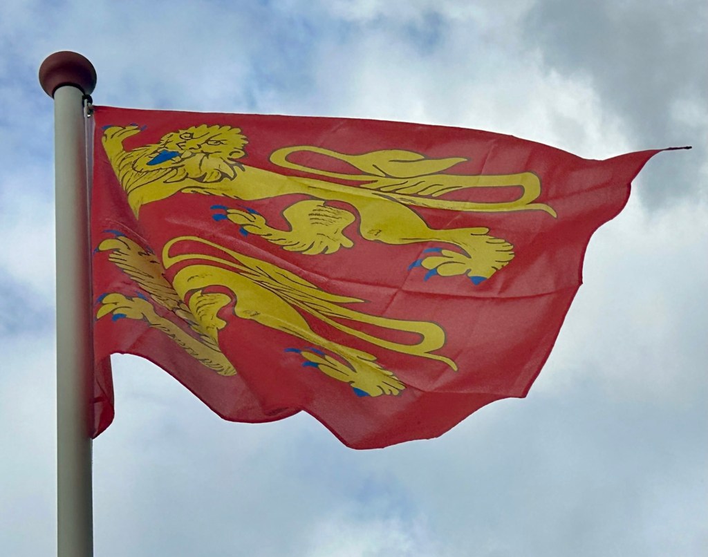 Onder de banderol van het wapen zien we de drietand van de nationale vlag terug.