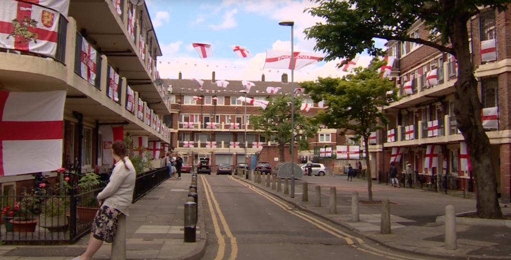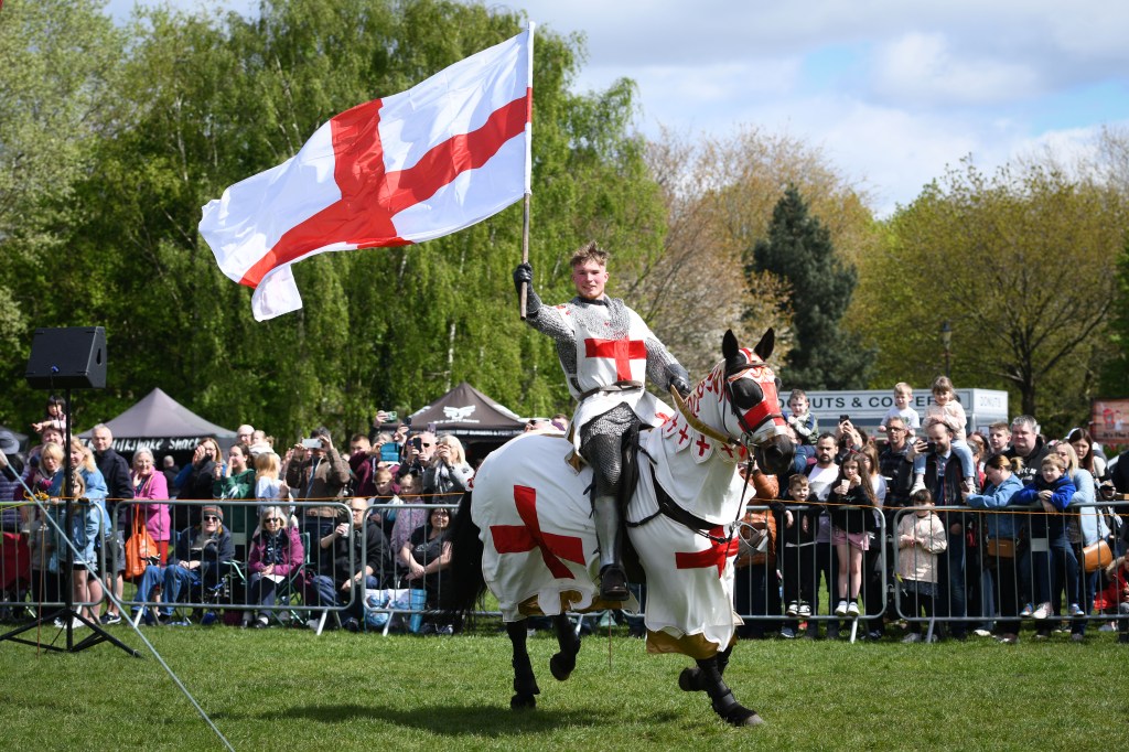 Op verschillende plaatsen in Engeland wordt Saint George’s Day gevierd met re-enactments van toernooien, zoals hier in Temworth, Staffordshire in 2024, waarbij de kleuren en de vlag van Sint-Joris niet ontbreken (fotograaf onbekend)