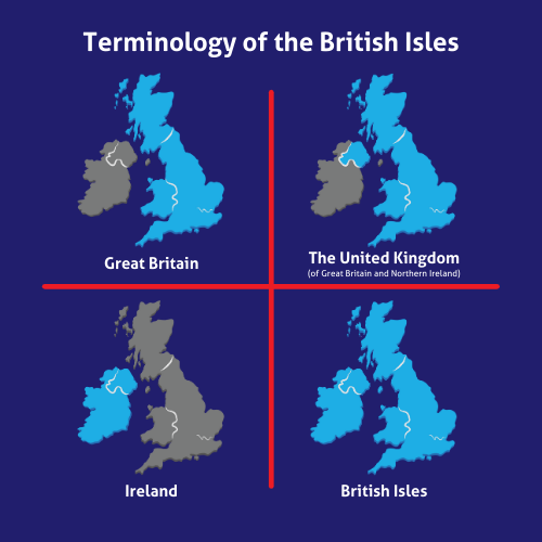 Als we met het plaatje rechtsonder beginnen: daar zien we alles blauw gekleurd, de twee eilanden samen worden de Britse Eilanden (British Isles) genoemd. Linksboven zien we het grootste eiland blauw gekleurd: de naam van dit eiland is Groot-Brittannië (en bestaat dus uit Engeland, Schotland en Wales). Rechtsboven zien we het Verenigd Koninkrijk in blauw, waartoe dus Noord-Ierland behoort en het gehele eiland Groot-Brittannië. Linksonder tenslotte is het eiland Ierland, dat bestaat uit de Ierse Republiek en Noord-Ierland (dat tot het Verenigd Koninkrijk behoort).