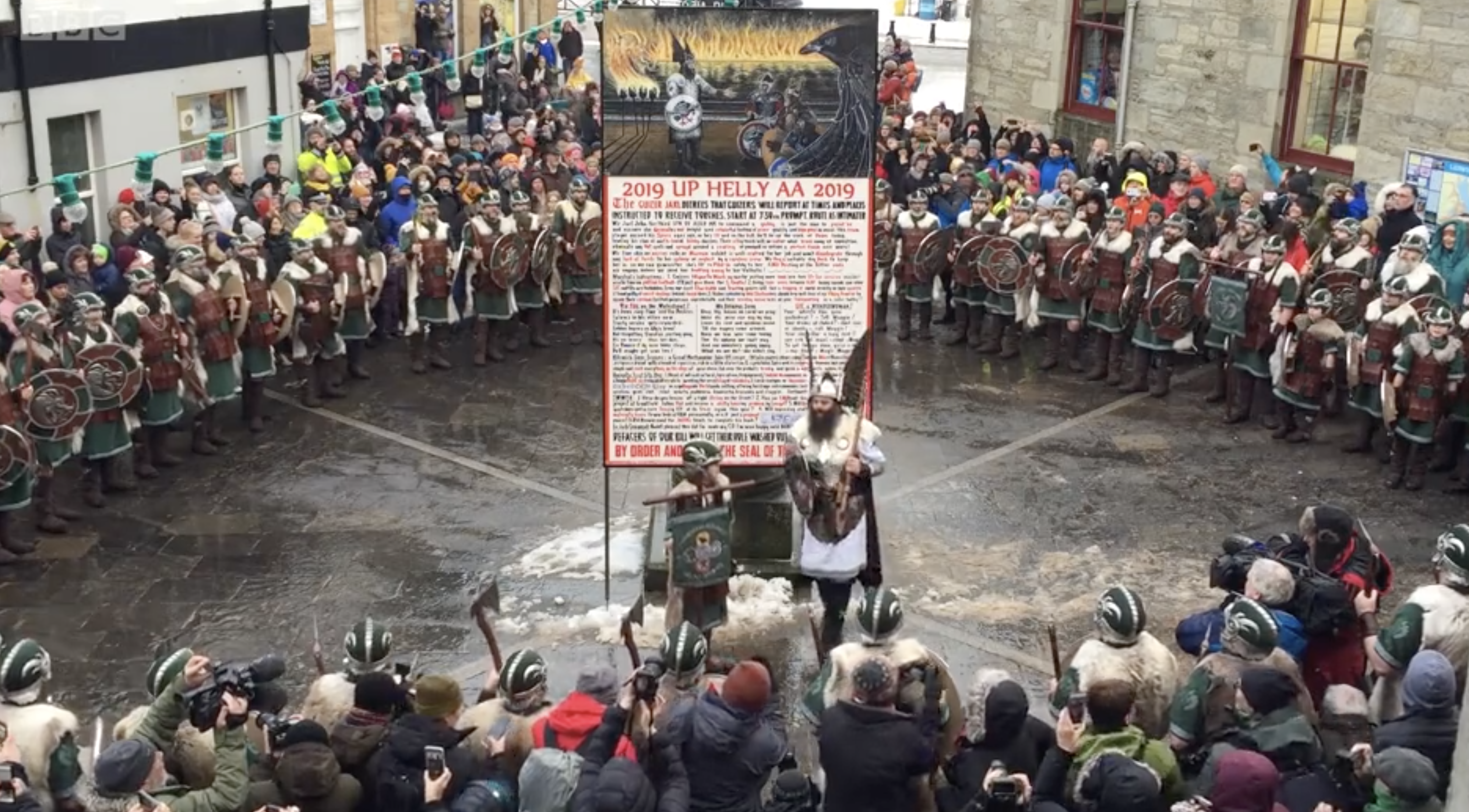 Jarl John Nicholson, in de rol van Thorstein Egilsson, en zijn assistent, bij het Up Helly Aa-plakkaat in Lerwick, in 2019 (screenshot)