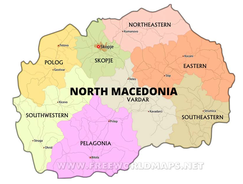 De historische regio Macedonië is hier in blauw aangegeven, waarbij we kunnen zien dat het Noord-Macedonië daar binnen valt, maar ook het noorden van Griekenland en het zuidwesten van Bulgarije