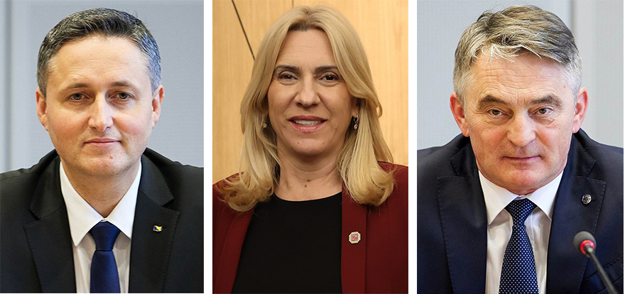 De drie leden van het presidentschap van Bosnië en Herzegovina, v.l.n.r.: Denis Bećirović(1975) voor de Bosniakken, Željka Cvijanović(1967) voor de Bosnische Serviërs en Željko Komšić (1964) voor de Kroaten (alle drie publiek domein)