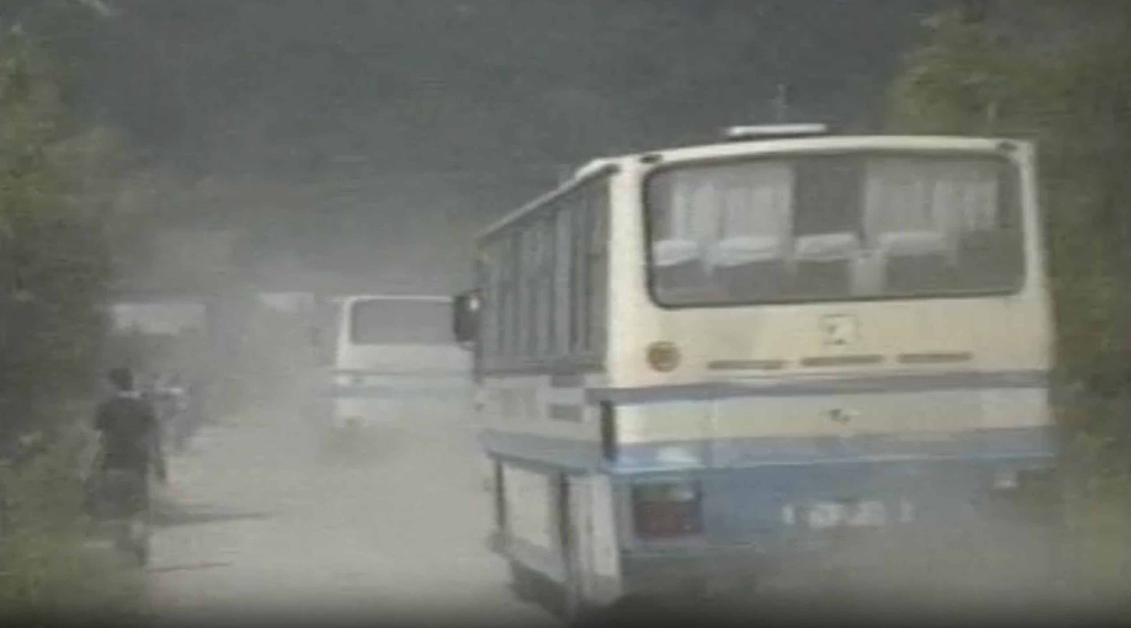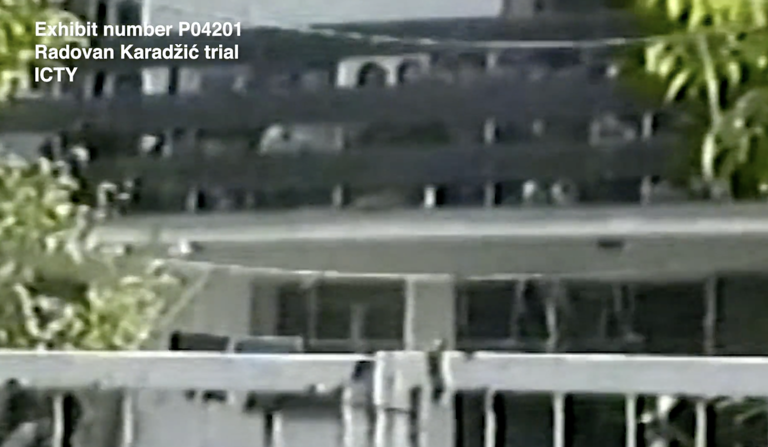 Screenshot uit een video waarin te zien hoe mannen van vrouwen worden gescheiden, later gebruikt in de rechtszaak van het Joegoslaviëtribunaal tegen Radovan Karadžić