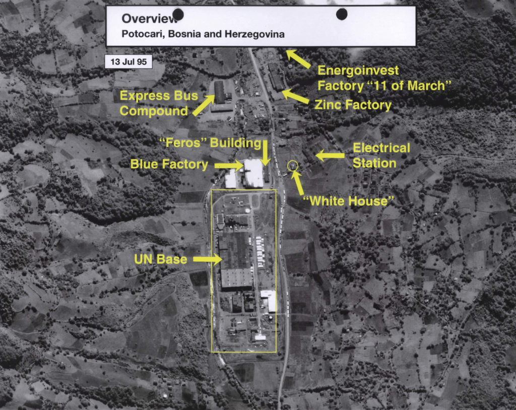Luchtfoto gemaakt door de U.S. National Geospatial Intelligence Agency van de militaire basis van Potočari en directe omgeving op 13 juli 1995, ook ‘het Witte Huis’ staat aangegeven (International Criminal Tribunal for Yugoslavia (ICTY))