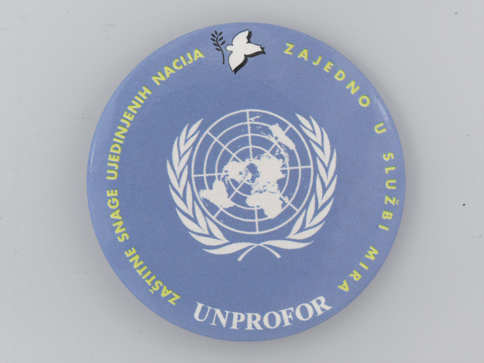Badge van UNPROFOR, de teksten luiden ‘VN Beschermingstroepen / Samen in de dienst van vrede’ (publiek domein)