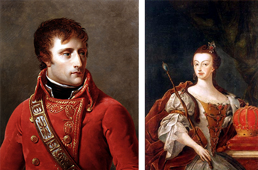 Links: Napoleon Bonaparte (1796-1821), detail van een portret uit circa 1802 door Antoine-Jean Gros (1771-1825) (Collectie Musée de la Légion d’Honneur, Parijs) (publiek domein) / Rechts: Koningin-weduwe Maria I van Portugal (1734-1816), portret uit circa 1808 door José Leandro de Carvalho (1770-1834) (Collectie Museu Histórivo Nacional, Rio de Janeiro) (publiek domein)