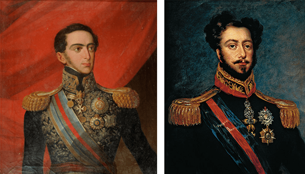 Links: Koningin Maria II van Portugal (1819-1853), olieverfschilderij uit circa 1837 door John Simpson (1782-1847) (Collectie Museu Imperial, Petrópolis, Brazilië) (publiek domein) / Rechts: Keizer Pedro II van Brazilië (1825-1891), kopie van een daguerrotype uit circa 1848 (Collectie Princesa Isabel: Fotografia do século XIX) (publiek domein)