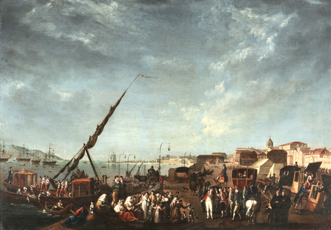 “Embarque da Família Real para o Brasil”, schilderij waarop de vlucht van de Portugese Koninklijke Familie op 29 november 1807 te zien is, toegeschreven aan Nicolas-Louis-Albert Delerive (1755-1818) (Collectie Museu Nacional dos Coches, Lissabon) (publiek domein)