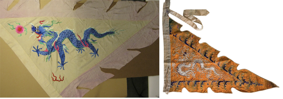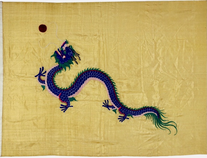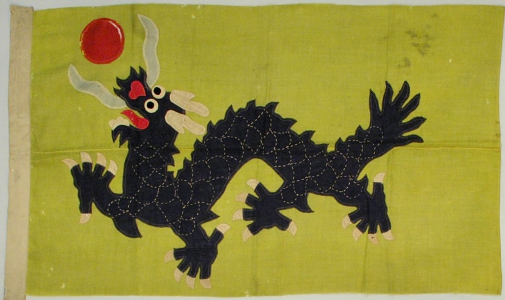 Deze driehoekige vlag, eveneens geel met een draak, kwam niet zomaar uit de lucht vallen: ze was afgeleid van een van de zogenaamde Acht Banieren, die vanaf de 17e eeuw in gebruik waren, in eerste instantie als legervaandels.
