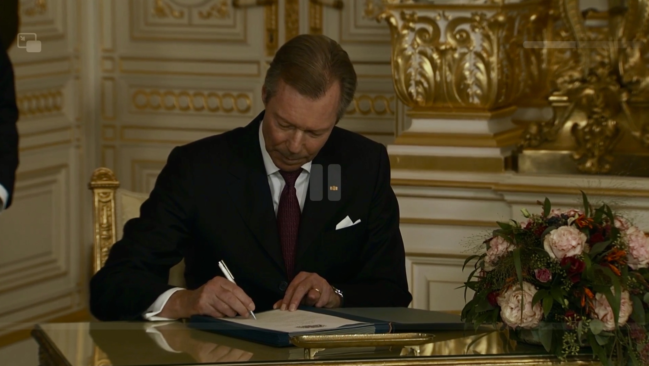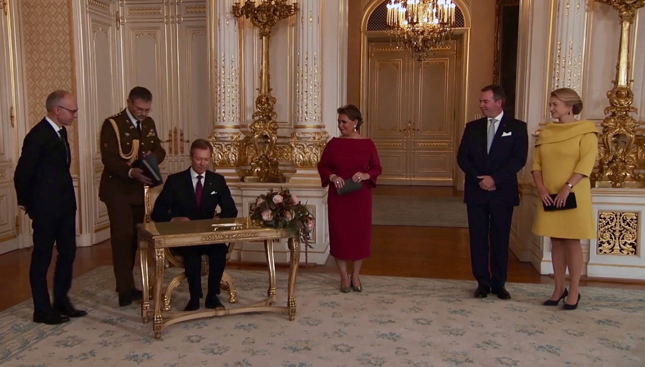 Hierna was het tijd voor de ondertekening en begaf de Koningin zich naar een ronde tafel aan de voet van het troonplatform. De Koningin kreeg de akte voorgelegd door haar Directeur van het Kabinet van de Koningin, Marie Anne Tellegen, onder het toeziend oog van ceremoniemeester Jonkheer Dirk Georg de Graeff.
