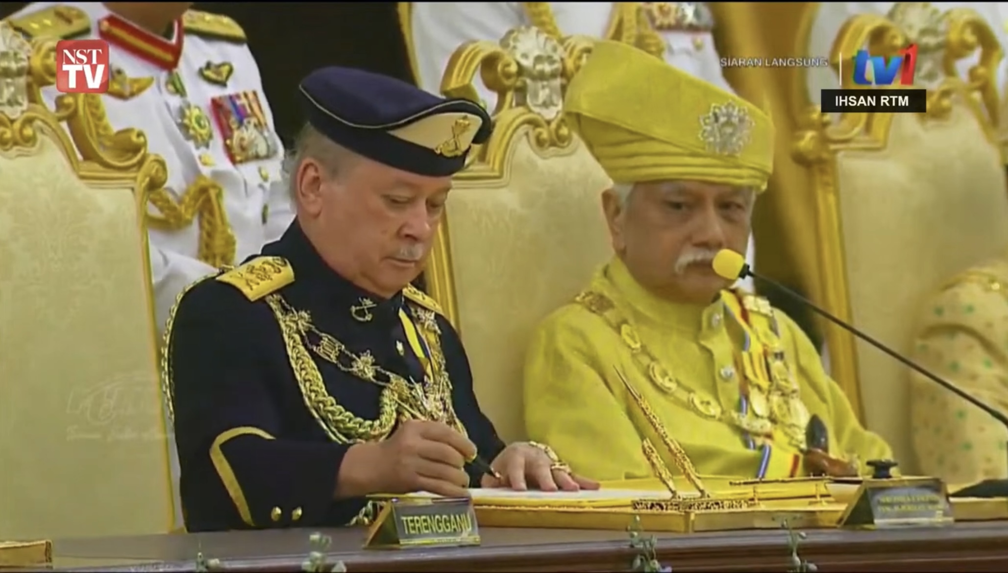 Sultan Ibrahim salueert voor het inspecteren van de troepen, links de koninklijke standaard van de koningin, rechts die van de koningDe sultan inspecteert de erewachtDe ceremonie gaat verder in het Istana Negara (Nationaal Paleis)De sultan tekent zijn ambtsaanvaarding en is daarmee koning van de federatieZijn eerste handtekening als koningLinks: Kaart van West-Maleisië met de negen sultanaten van de federatie: Perlis, Kedah, Perak, Kelantan, Terengganu, Pahang, Selangor, Negeri Sembilan en Johor, de twee kleinere gebieden Penang en Malakka hebben een gouverneur i.p.v. een sultan en maakten vroeger deel uit van de Straits Settlements / Rechts: Kaart van Oost-Maleisië met de staten Sarawak en Sabah, gelegen op het eiland Borneo, net als Penang en Malakka geen sultanaten, net zo minals de drie federale territoria: Kuala Lumpur en Patrajaya (stadsterritoria) en Labuan (een eiland voor de kust van Sabah)