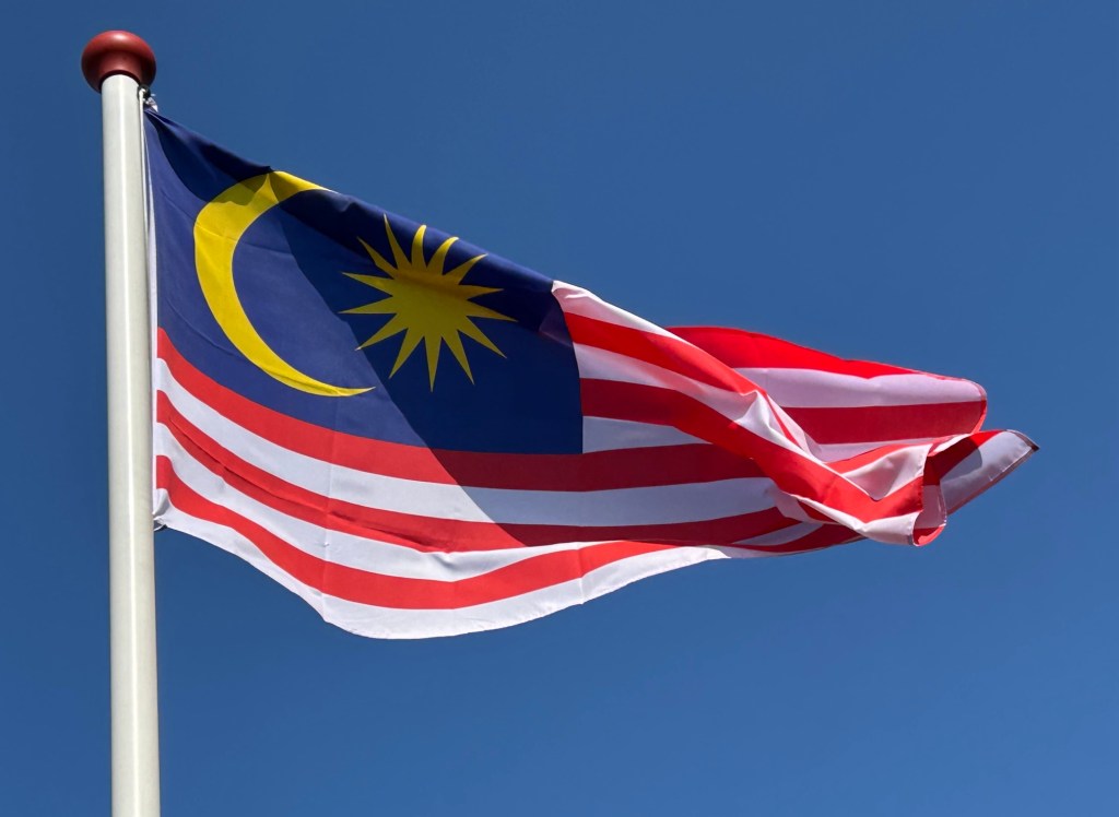 De vlag van Maleisië bestaat uit zeven rode en zeven witte horizontale strepen met een blauw kanton waarop een gele halve maan en een gele veertienpuntige ster.