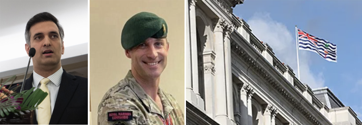 V.l.n.r.: Nishi Dholakia, commissaris voor het Brits Indische Oceaanterritorium (fotograaf onbekend) / Commander Andrew Williams, opperbevelhebber van het territorium sinds 24 januari 2025 (fotograaf onbekend) / De vlag van het Brits Indische Oceaanterritorium op het gebouw van het Foreign Office (Buitenlandse Zaken) in Londen