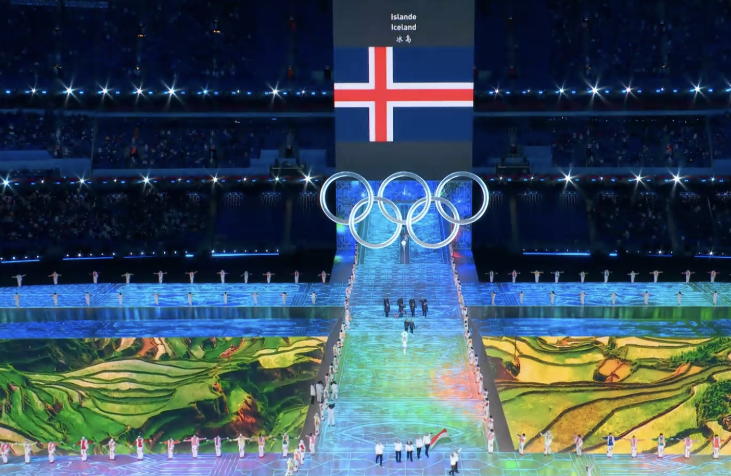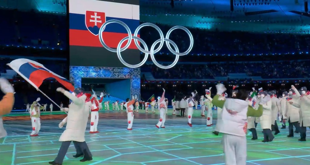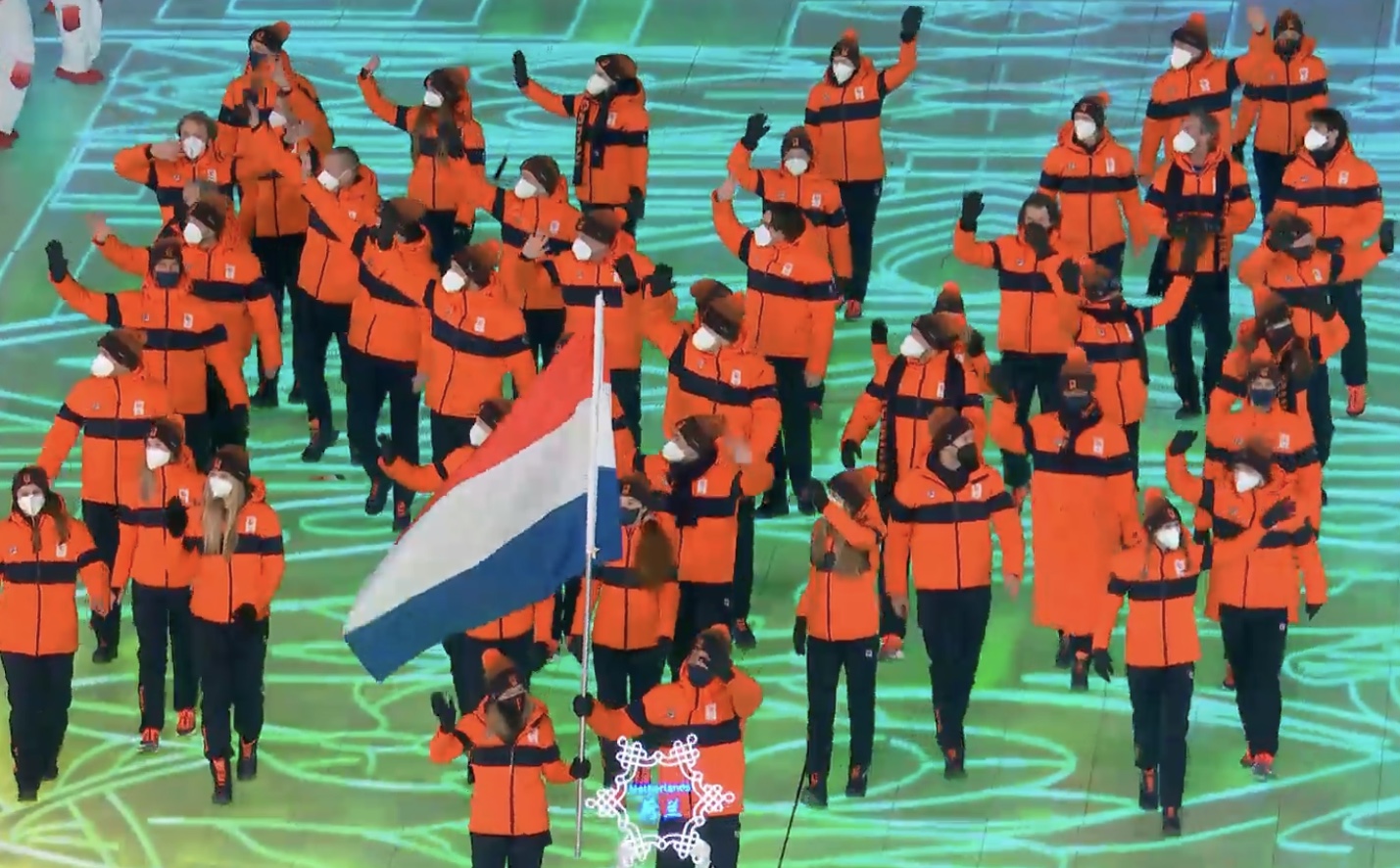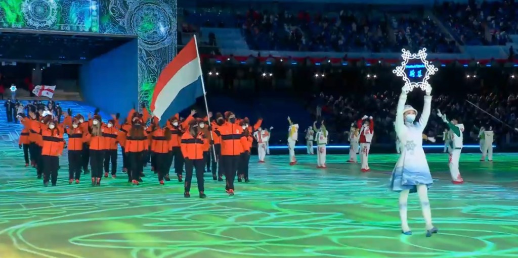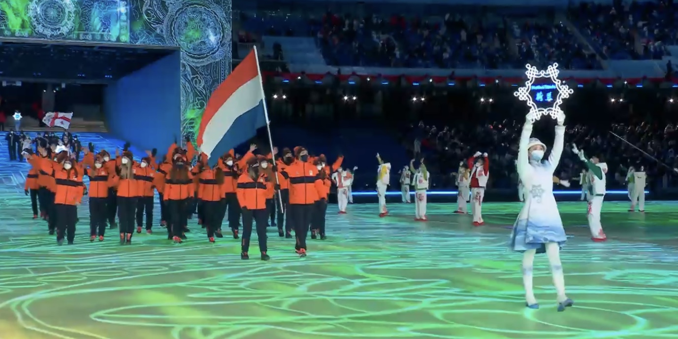 De 24e Olympische WinterspelenDe Olympische ringen rijzen op uit een blok ijsOlympische ringen van ijs in Het VogelnestZoals te doen gebruikelijk opent Griekenland, als bakermat van de Olympische Spelen, de vlaggenparadeEntree van de kleine equipe van EcuadorHet kan het publiek niet ontgaan welk land het stadion binnenkomt, in dit geval EcuadorBinnenkomst van BelgiëDe Belgische equipeTaiwan, dat door China als een afvallige provincie wordt gezien, doet noodgedwongen mee onder de naam Chinese Taipei (Taipei is de hoofdstad van Taiwan, wat vroeger als Formosa bekend stond)Chinese Taipei alias Taiwan, doet dan ook mee onder een speciaal gecreëerde Olympische landenvlagDe andere Chinese ‘dwarsligger’ is Hongkong, wat tot 1997 onder Brits bestuur viel en daarna volgens afspraak werd overgedragen aan China, als ‘speciale bestuurlijke regio’Binnenkomst van de ploeg uit HongkongBinnenkomst van de Brazilianen met hun vlag, de ‘Verde e Amarela’ (‘Groen en Geel’)Entree van de kleine ploeg van Oost-Timor……en die van de niet veel grotere ploeg van LuxemburgDe Luxemburgse ploeg werd begroet door Groothertog Henri, met de alternatieve vlag van Luxemburg, de ‘Roude Léiw’ (‘Rode Leeuw’)Binnenkomst van de kleine ploegen van Nigeria……en GhanaDe grote ploeg van Canada was nummer 27 in de vlaggenparadeEntree van San MarinoDe mini-afvaardiging van KirgiziëBinnenkomsten van Armenië……en SpanjeAls (weliswaar klein) Alpenland mocht Liechtenstein natuurlijk niet ontbrekenIedere equipe werd voorafgegaan door een een dame met een groot formaat sneeuwvlok met de naam van het betreffende land in het Engels en het ChineesBinnenkomst van de Iraanse ploeg……op de voet gevolgd door IJslandUiteraard was het kleine, maar zeer bergachtige prinsdom Andorra ook van de partijBinnenkomst van Finland……en KroatiëSaudi-Arabië debuteert bij de WinterspelenBinnenkomsten van Albanië,……Azerbeidzjan……en LetlandZoals in de inleiding al vermeld, komen Russische sporters uit onder een speciale Olympische vlag, onder de naam ROC (Russisch Olympisch Comité)De vlag van het ROC laat de Olympische ringen zien met daarboven een gestileerde vlam in de nationale Russische kleurenDe grote Franse ploeg, Frankrijk organiseert in 2024 de XXXIIIe Olympische ZomerspelenEntree van de ploegen uit Polen, ……Puerto Rico……en BoliviaUiteraard heeft Noorwegen als noordelijk land een grote ploeg afgevaardigdKosovo is aan de beurtDe Kosovaarse ploegEntree van de Verenigde Staten……met een flinke ploegDe ploeg van Amerikaans Samoa is heel wat kleiner……maar wél opvallender met de luchtige kledij (bij -5ºC) van de geoliede vlagdrager Nathan CrumptonBinnenkomst van de Nederlandse ploegVoorop: vlaggendragers Kjeld Nuis en Lindsay van ZundertEntree van Trinidad en Tobago, ……Peru……en HaïtiEen Filipijnse supporter met vlag op de tribuneDe equipe uit SlowakijeEnthousiaste Zuid-Koreaanse supporters op de tribuneBinnenkomsten van Montenegro, …—de grote ploeg uit Zwitserland, ……die van Nieuw-Zeeland……en DuitslandPrins Albert van Monaco was ook naar China overgekomen om zijn landgenoten aan te moedigenBinnenkomst van Australië……en als een-na-laatste land komt Italië binnen, dit land organiseert de Winterspelen van 2026 in Milaan en Cortina d’AmpezzoHekkensluiter is uiteraard het gastland ChinaBinnenkomst van de grote Chinese ploegVlaggenzwaaiende Chinese deelnemersDe thuisploeg werd enthousiast onthaald in het VogelnestDe Olympische (stadion)vlag wordt binnengebrachtDe sporters hebben de vlag op het podium overgedragen aan militairen die de vlag zullen hijsen, naast de vlag van ChinaDe Olympische vlag wordt gehesenEen kleinere Olympische vlag zal dienen om de Olympische eed bij af te leggenDe Olympische eed wordt uitgesproken op het vlagpodium……en dat gaat in duetDe finale van de opening nadert met het aansteken van de Olympische vlam in het midden van een enorm ijskristal, waarin de namen van de deelnemende landenDe Olympische vlam is geplaatstHet Olympisch vuur van de Winterspelen 2022Als afsluiting is er vuurwerk, o.a. in de vorm van de Olympische ringen