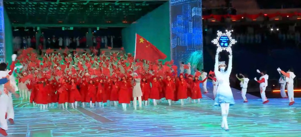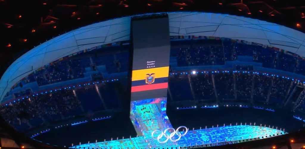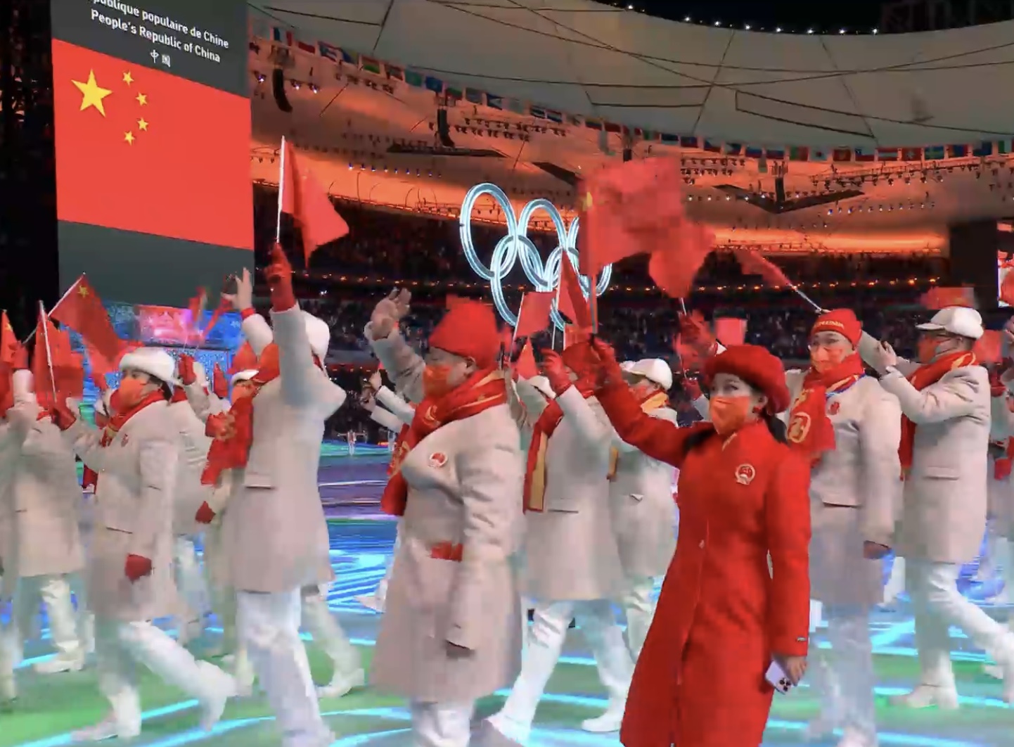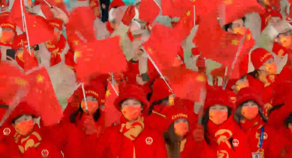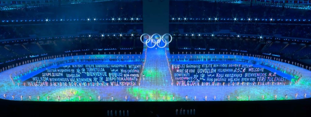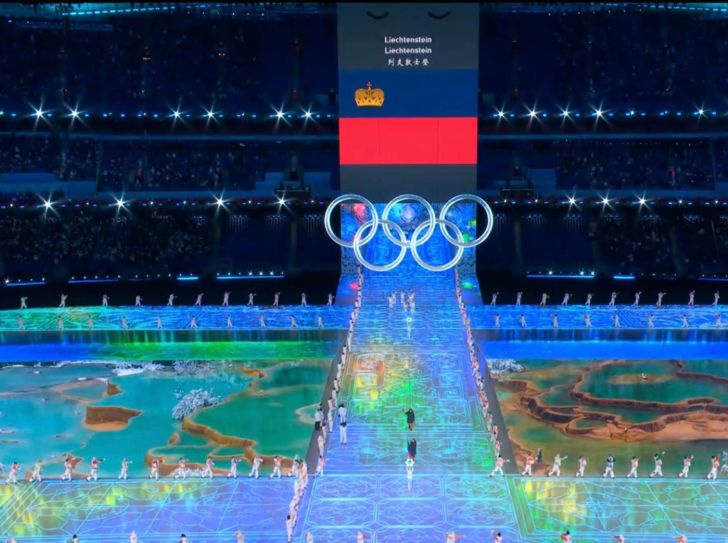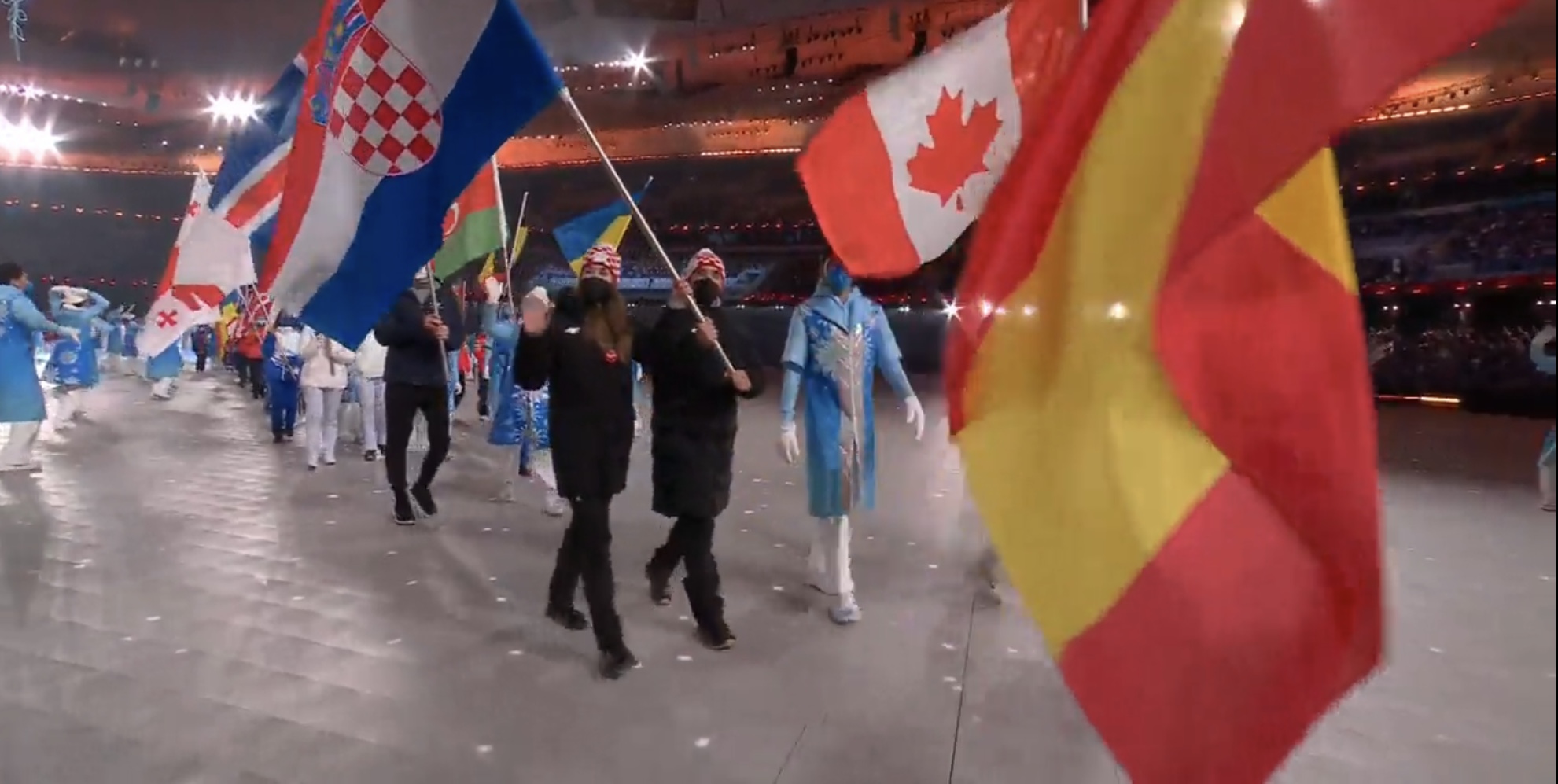 De 24e Olympische WinterspelenDe Olympische ringen rijzen op uit een blok ijsOlympische ringen van ijs in Het VogelnestZoals te doen gebruikelijk opent Griekenland, als bakermat van de Olympische Spelen, de vlaggenparadeEntree van de kleine equipe van EcuadorHet kan het publiek niet ontgaan welk land het stadion binnenkomt, in dit geval EcuadorBinnenkomst van BelgiëDe Belgische equipeTaiwan, dat door China als een afvallige provincie wordt gezien, doet noodgedwongen mee onder de naam Chinese Taipei (Taipei is de hoofdstad van Taiwan, wat vroeger als Formosa bekend stond)Chinese Taipei alias Taiwan, doet dan ook mee onder een speciaal gecreëerde Olympische landenvlagDe andere Chinese ‘dwarsligger’ is Hongkong, wat tot 1997 onder Brits bestuur viel en daarna volgens afspraak werd overgedragen aan China, als ‘speciale bestuurlijke regio’Binnenkomst van de ploeg uit HongkongBinnenkomst van de Brazilianen met hun vlag, de ‘Verde e Amarela’ (‘Groen en Geel’)Entree van de kleine ploeg van Oost-Timor……en die van de niet veel grotere ploeg van LuxemburgDe Luxemburgse ploeg werd begroet door Groothertog Henri, met de alternatieve vlag van Luxemburg, de ‘Roude Léiw’ (‘Rode Leeuw’)Binnenkomst van de kleine ploegen van Nigeria……en GhanaDe grote ploeg van Canada was nummer 27 in de vlaggenparadeEntree van San MarinoDe mini-afvaardiging van KirgiziëBinnenkomsten van Armenië……en SpanjeAls (weliswaar klein) Alpenland mocht Liechtenstein natuurlijk niet ontbrekenIedere equipe werd voorafgegaan door een een dame met een groot formaat sneeuwvlok met de naam van het betreffende land in het Engels en het ChineesBinnenkomst van de Iraanse ploeg……op de voet gevolgd door IJslandUiteraard was het kleine, maar zeer bergachtige prinsdom Andorra ook van de partijBinnenkomst van Finland……en KroatiëSaudi-Arabië debuteert bij de WinterspelenBinnenkomsten van Albanië,……Azerbeidzjan……en LetlandZoals in de inleiding al vermeld, komen Russische sporters uit onder een speciale Olympische vlag, onder de naam ROC (Russisch Olympisch Comité)De vlag van het ROC laat de Olympische ringen zien met daarboven een gestileerde vlam in de nationale Russische kleurenDe grote Franse ploeg, Frankrijk organiseert in 2024 de XXXIIIe Olympische ZomerspelenEntree van de ploegen uit Polen, ……Puerto Rico……en BoliviaUiteraard heeft Noorwegen als noordelijk land een grote ploeg afgevaardigdKosovo is aan de beurtDe Kosovaarse ploegEntree van de Verenigde Staten……met een flinke ploegDe ploeg van Amerikaans Samoa is heel wat kleiner……maar wél opvallender met de luchtige kledij (bij -5ºC) van de geoliede vlagdrager Nathan CrumptonBinnenkomst van de Nederlandse ploegVoorop: vlaggendragers Kjeld Nuis en Lindsay van ZundertEntree van Trinidad en Tobago, ……Peru……en HaïtiEen Filipijnse supporter met vlag op de tribuneDe equipe uit SlowakijeEnthousiaste Zuid-Koreaanse supporters op de tribuneBinnenkomsten van Montenegro, …—de grote ploeg uit Zwitserland, ……die van Nieuw-Zeeland……en DuitslandPrins Albert van Monaco was ook naar China overgekomen om zijn landgenoten aan te moedigenBinnenkomst van Australië……en als een-na-laatste land komt Italië binnen, dit land organiseert de Winterspelen van 2026 in Milaan en Cortina d’AmpezzoHekkensluiter is uiteraard het gastland ChinaBinnenkomst van de grote Chinese ploegVlaggenzwaaiende Chinese deelnemersDe thuisploeg werd enthousiast onthaald in het VogelnestDe Olympische (stadion)vlag wordt binnengebrachtDe sporters hebben de vlag op het podium overgedragen aan militairen die de vlag zullen hijsen, naast de vlag van ChinaDe Olympische vlag wordt gehesenEen kleinere Olympische vlag zal dienen om de Olympische eed bij af te leggenDe Olympische eed wordt uitgesproken op het vlagpodium……en dat gaat in duetDe finale van de opening nadert met het aansteken van de Olympische vlam in het midden van een enorm ijskristal, waarin de namen van de deelnemende landenDe Olympische vlam is geplaatstHet Olympisch vuur van de Winterspelen 2022Als afsluiting is er vuurwerk, o.a. in de vorm van de Olympische ringen
