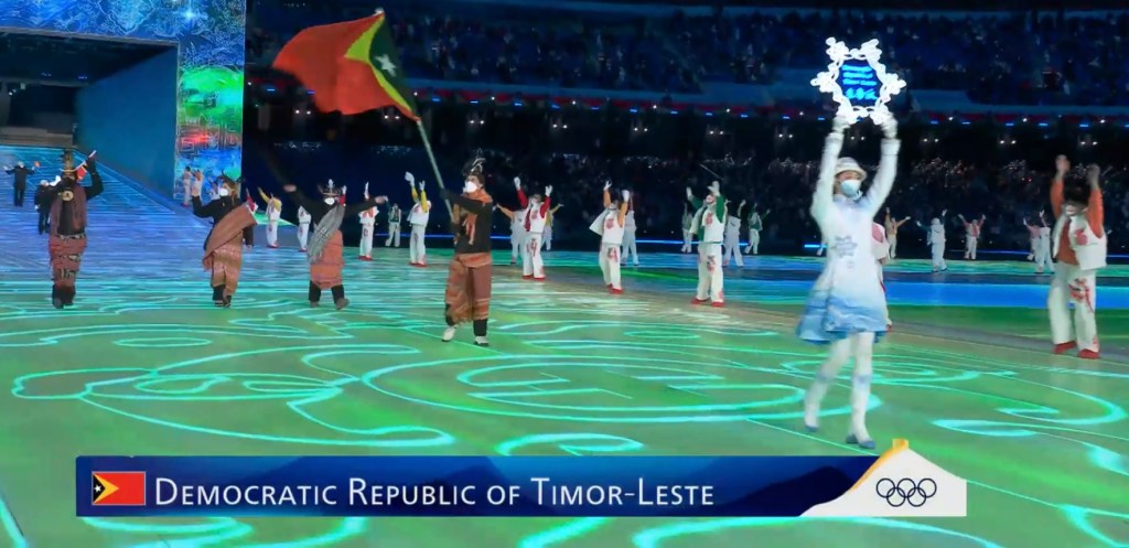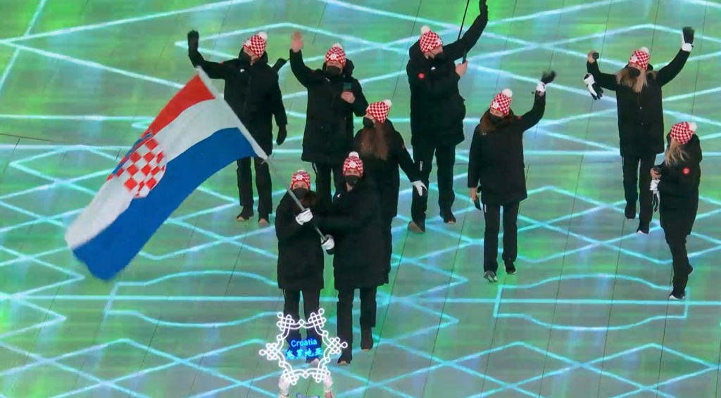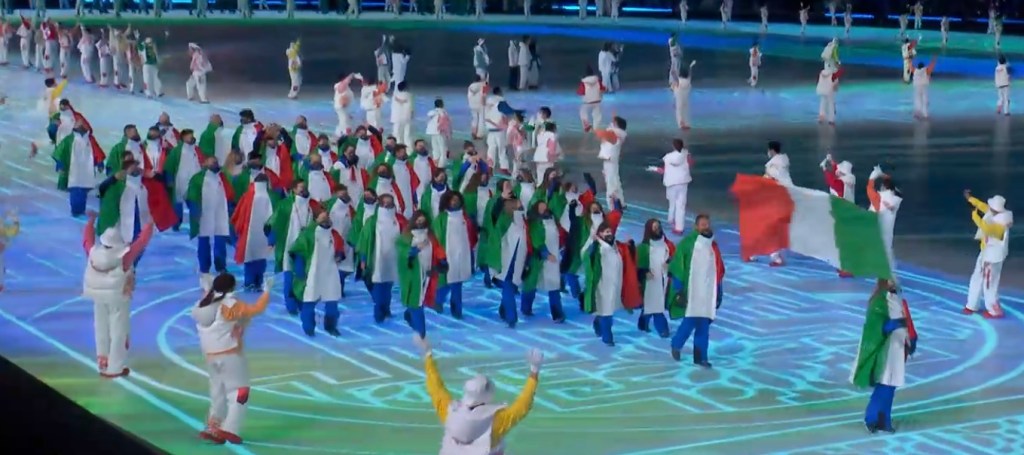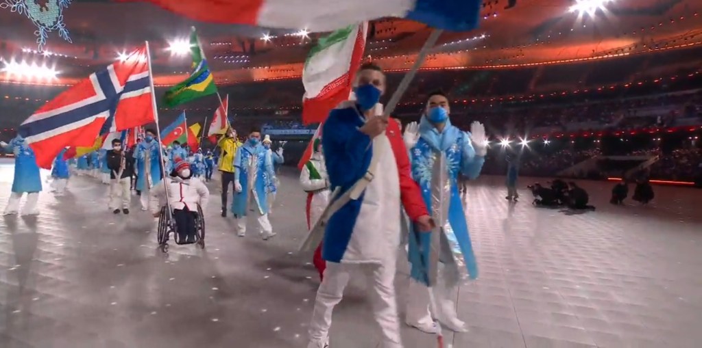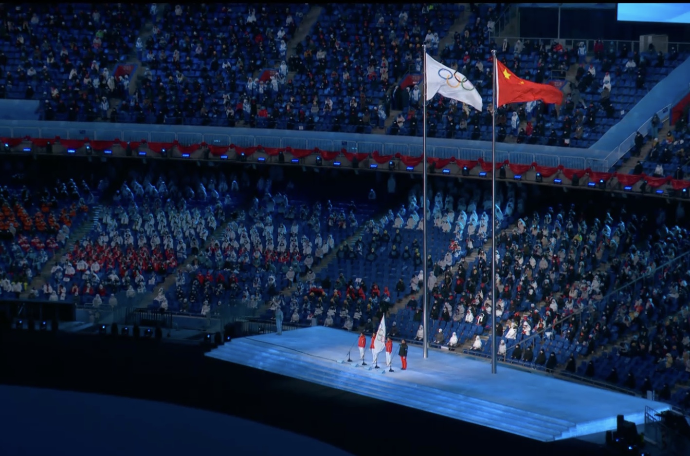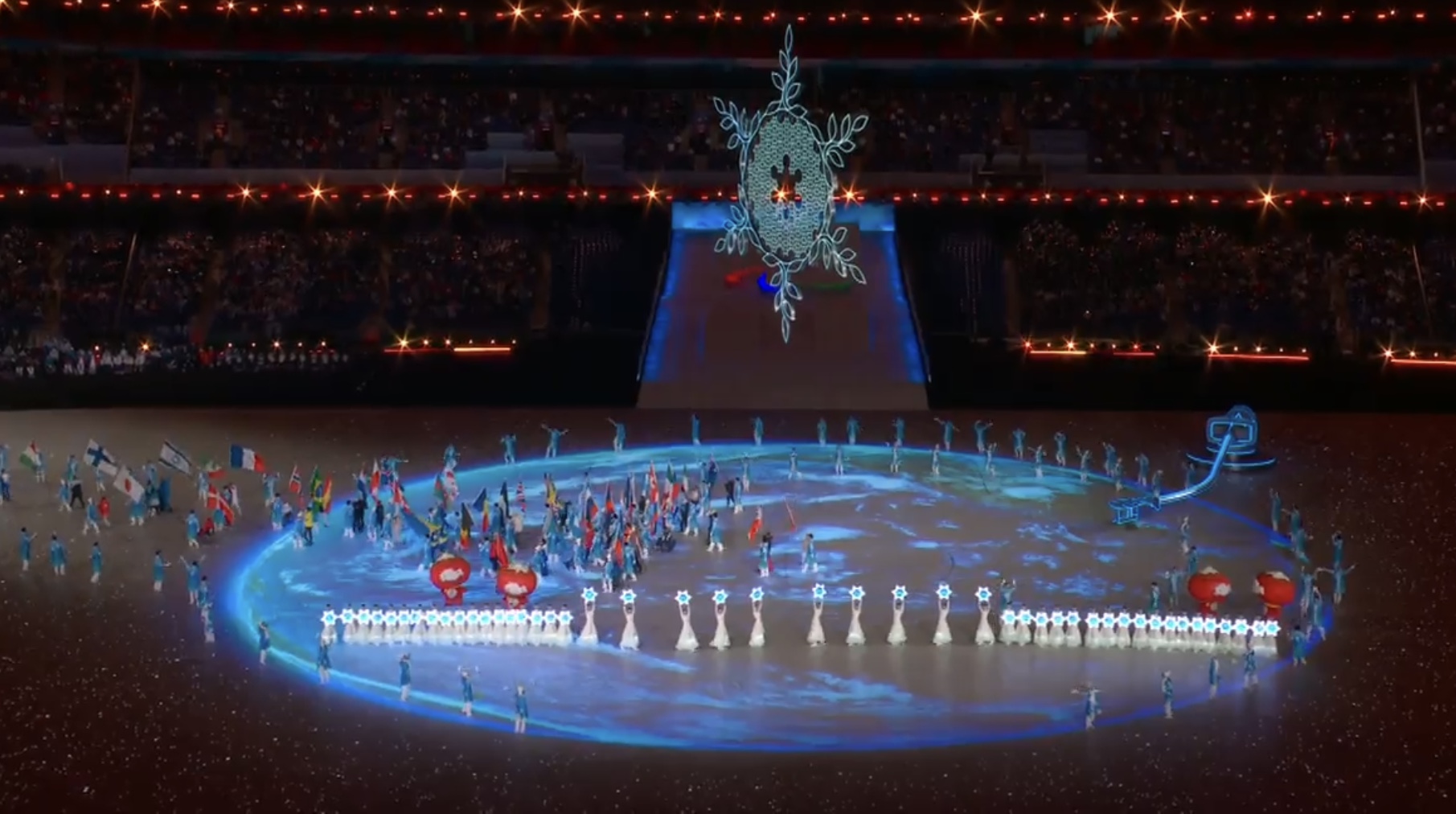 De 24e Olympische WinterspelenDe Olympische ringen rijzen op uit een blok ijsOlympische ringen van ijs in Het VogelnestZoals te doen gebruikelijk opent Griekenland, als bakermat van de Olympische Spelen, de vlaggenparadeEntree van de kleine equipe van EcuadorHet kan het publiek niet ontgaan welk land het stadion binnenkomt, in dit geval EcuadorBinnenkomst van BelgiëDe Belgische equipeTaiwan, dat door China als een afvallige provincie wordt gezien, doet noodgedwongen mee onder de naam Chinese Taipei (Taipei is de hoofdstad van Taiwan, wat vroeger als Formosa bekend stond)Chinese Taipei alias Taiwan, doet dan ook mee onder een speciaal gecreëerde Olympische landenvlagDe andere Chinese ‘dwarsligger’ is Hongkong, wat tot 1997 onder Brits bestuur viel en daarna volgens afspraak werd overgedragen aan China, als ‘speciale bestuurlijke regio’Binnenkomst van de ploeg uit HongkongBinnenkomst van de Brazilianen met hun vlag, de ‘Verde e Amarela’ (‘Groen en Geel’)Entree van de kleine ploeg van Oost-Timor……en die van de niet veel grotere ploeg van LuxemburgDe Luxemburgse ploeg werd begroet door Groothertog Henri, met de alternatieve vlag van Luxemburg, de ‘Roude Léiw’ (‘Rode Leeuw’)Binnenkomst van de kleine ploegen van Nigeria……en GhanaDe grote ploeg van Canada was nummer 27 in de vlaggenparadeEntree van San MarinoDe mini-afvaardiging van KirgiziëBinnenkomsten van Armenië……en SpanjeAls (weliswaar klein) Alpenland mocht Liechtenstein natuurlijk niet ontbrekenIedere equipe werd voorafgegaan door een een dame met een groot formaat sneeuwvlok met de naam van het betreffende land in het Engels en het ChineesBinnenkomst van de Iraanse ploeg……op de voet gevolgd door IJslandUiteraard was het kleine, maar zeer bergachtige prinsdom Andorra ook van de partijBinnenkomst van Finland……en KroatiëSaudi-Arabië debuteert bij de WinterspelenBinnenkomsten van Albanië,……Azerbeidzjan……en LetlandZoals in de inleiding al vermeld, komen Russische sporters uit onder een speciale Olympische vlag, onder de naam ROC (Russisch Olympisch Comité)De vlag van het ROC laat de Olympische ringen zien met daarboven een gestileerde vlam in de nationale Russische kleurenDe grote Franse ploeg, Frankrijk organiseert in 2024 de XXXIIIe Olympische ZomerspelenEntree van de ploegen uit Polen, ……Puerto Rico……en BoliviaUiteraard heeft Noorwegen als noordelijk land een grote ploeg afgevaardigdKosovo is aan de beurtDe Kosovaarse ploegEntree van de Verenigde Staten……met een flinke ploegDe ploeg van Amerikaans Samoa is heel wat kleiner……maar wél opvallender met de luchtige kledij (bij -5ºC) van de geoliede vlagdrager Nathan CrumptonBinnenkomst van de Nederlandse ploegVoorop: vlaggendragers Kjeld Nuis en Lindsay van ZundertEntree van Trinidad en Tobago, ……Peru……en HaïtiEen Filipijnse supporter met vlag op de tribuneDe equipe uit SlowakijeEnthousiaste Zuid-Koreaanse supporters op de tribuneBinnenkomsten van Montenegro, …—de grote ploeg uit Zwitserland, ……die van Nieuw-Zeeland……en DuitslandPrins Albert van Monaco was ook naar China overgekomen om zijn landgenoten aan te moedigenBinnenkomst van Australië……en als een-na-laatste land komt Italië binnen, dit land organiseert de Winterspelen van 2026 in Milaan en Cortina d’AmpezzoHekkensluiter is uiteraard het gastland ChinaBinnenkomst van de grote Chinese ploegVlaggenzwaaiende Chinese deelnemersDe thuisploeg werd enthousiast onthaald in het VogelnestDe Olympische (stadion)vlag wordt binnengebrachtDe sporters hebben de vlag op het podium overgedragen aan militairen die de vlag zullen hijsen, naast de vlag van ChinaDe Olympische vlag wordt gehesenEen kleinere Olympische vlag zal dienen om de Olympische eed bij af te leggenDe Olympische eed wordt uitgesproken op het vlagpodium……en dat gaat in duetDe finale van de opening nadert met het aansteken van de Olympische vlam in het midden van een enorm ijskristal, waarin de namen van de deelnemende landenDe Olympische vlam is geplaatstHet Olympisch vuur van de Winterspelen 2022Als afsluiting is er vuurwerk, o.a. in de vorm van de Olympische ringen