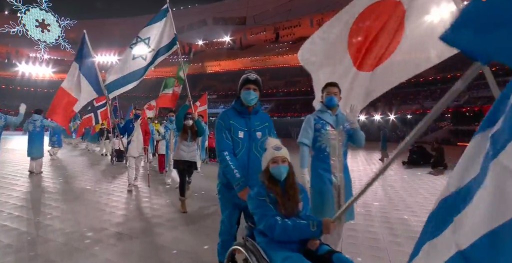Het Nationale Stadion van China in Beijing, het VogelnestHet 2022-logo verschijnt in de arenaHet publiek met Chinese vlaggetjesCheerleadersDe ploeg van Oekraïne komt opVoorop vlaggendrager en vijfvoudig medaillewinnaar Maksim YarovyiDe Oekraïense ploeg bestaat uit 20 man en werd luid toegejuicht, rechts Shuey Rhon Rhon, de mascotte van deze Paralympische SpelenEntree van de Nederlandse ploeg met als vlaggendragers de parasnowboarders Chris Vos en Lisa BunschotenDe Nederlandse ploegIPC-voorzitter Andrew Parsons houdt zijn openingstoespraak tegen de achtergrond van de 64 vlaggen van de deelnemende landenParsons tijdens zijn opvallend felle toespraak tégen geweld en vóór vredeUiteraard werd de openingsplechtigheid afgerond met vuurwerk!