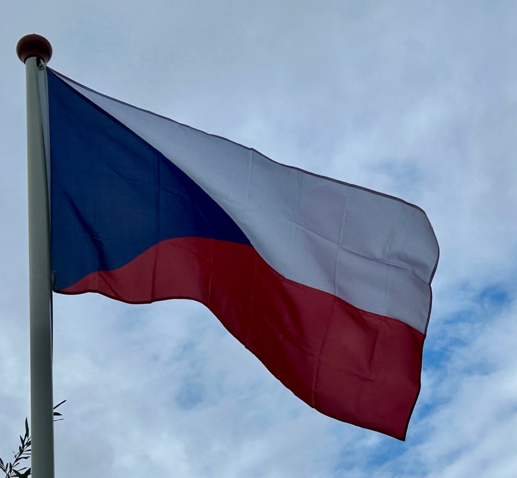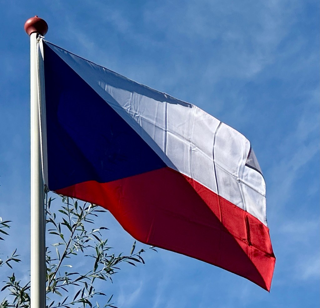 De vlag van Tsjechië is een horizontale tweekleur in wit-rood. Vanuit de broekingszijde een blauwe driehoek, waarvan de punt in het exacte midden van de vlag eindigt.