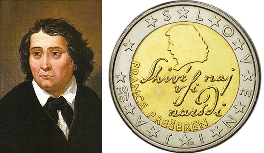 Links: France Prešeren, schilderij door Franz Kurz zum Thurn und Goldenstein (1807-1878) rond 1850 (publiek domein) / Rechts: Sloveense 2-euromunt uit 2007 met het portret van France Prešeren