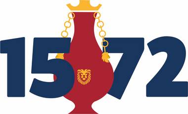 De maagd houdt aan haar andere zijde een schild vast met daarop een Romeinse roedenbundel met bijlen (fasces).