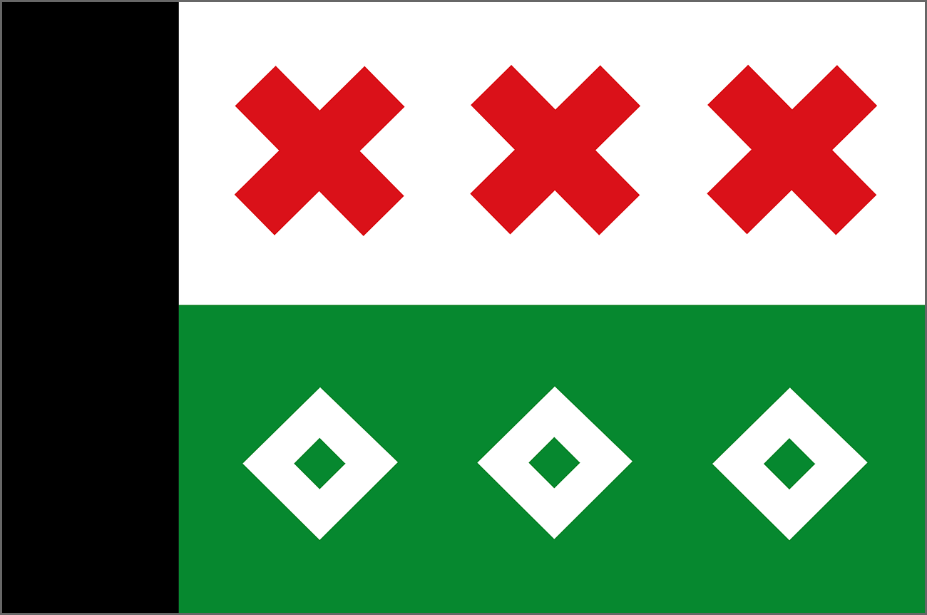 Twee banen van wit en groen, met op de witte baan drie rode schuinkruisjes en op de groene baan drie witte maliën, in de zin van de vlag regelmatig verdeeld, en langs de broeking een zwarte verticale baan ter lengte van 3/16 van de hoogte van de vlag.