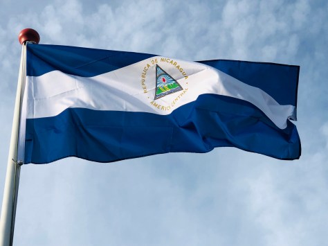 De vlag van Nicaragua is een horizontale driekleur in kobaltblauw-wit-kobaltblauw, met in het midden van de witte baan het staatswapen.