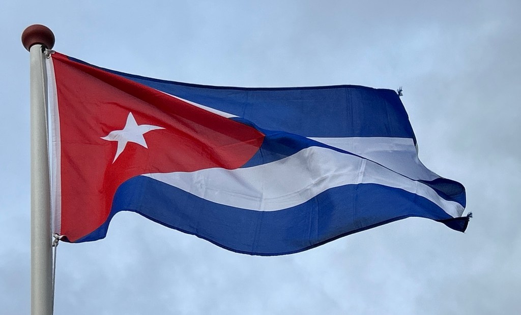 De vlag van Cuba bestaat uit vijf horizontale strepen, drie blauwe en twee witte met een rode driehoek aan de broekingszijde met daarin een witte vijfpuntige ster.