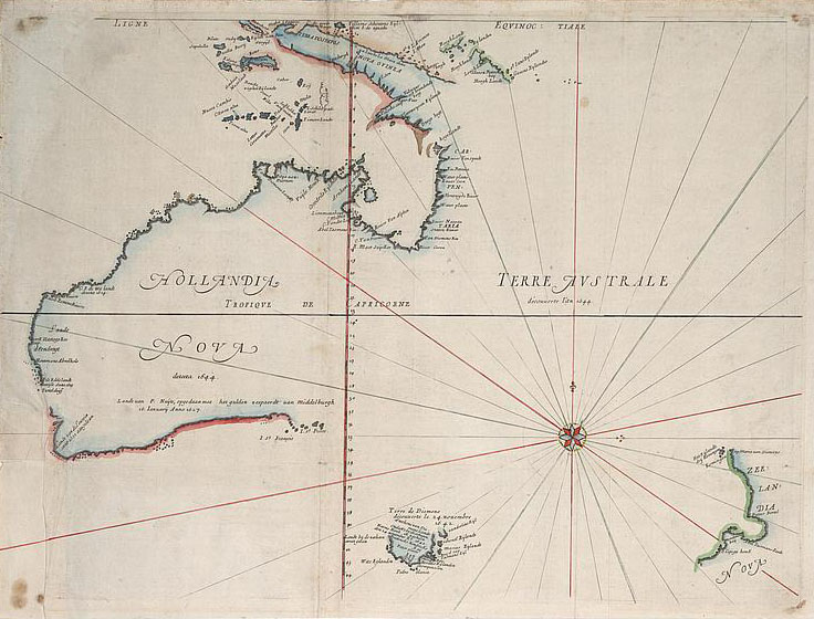 Kaart getiteld “Hollandia Nova en Terre Australe” uit 1663 van Melchisédech Thévenot (1620-1692), een kopie van een kaart van Joan Blaeu (1598/99-1673) uit 1659, links de westkust van Australië (Nieuw-Holland), middenonder het grootste gedeelte van Tasmanië (Van Diemensland) en rechts het toen bekende stuk van de westkust van Nieuw-Zeeland (Nova Zeelandia) (publiek domein)
