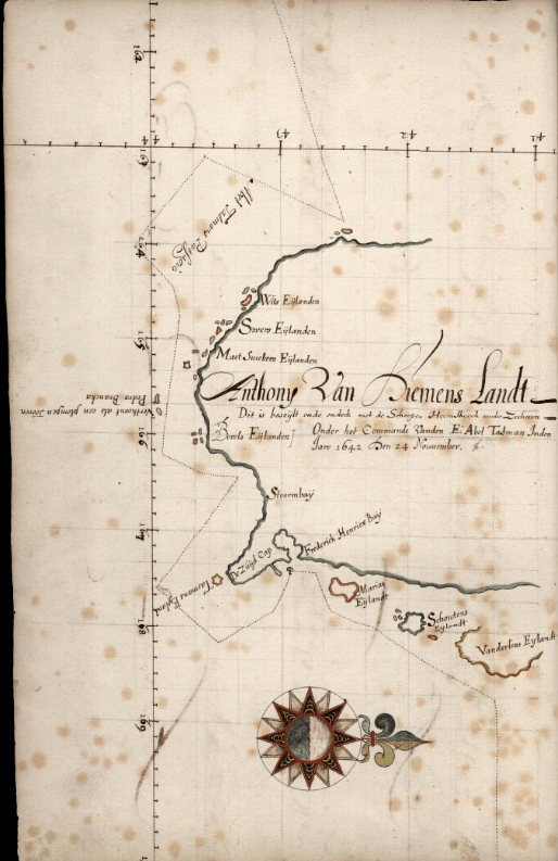 Het in kaart gebrachte deel van Tasmanië (Anthony van Diemens Land), uit het scheepsjournaal van Abel Tasman, waarbij rechts het noorden is (Collectie Nationaal Archief / publiek domein)