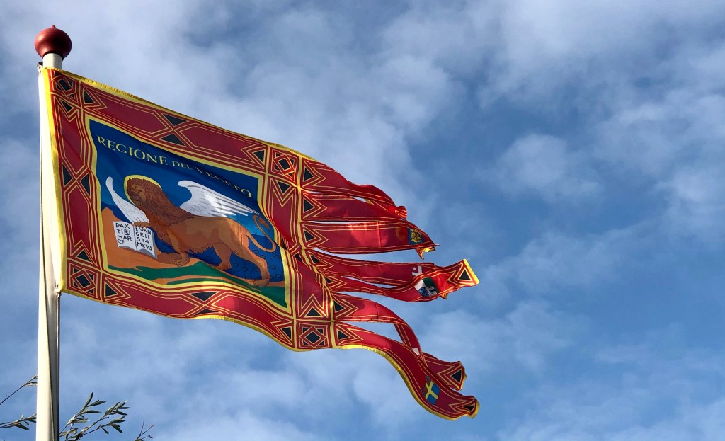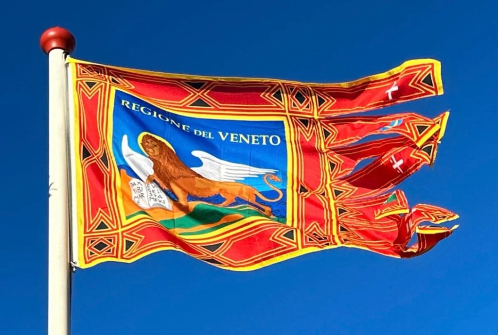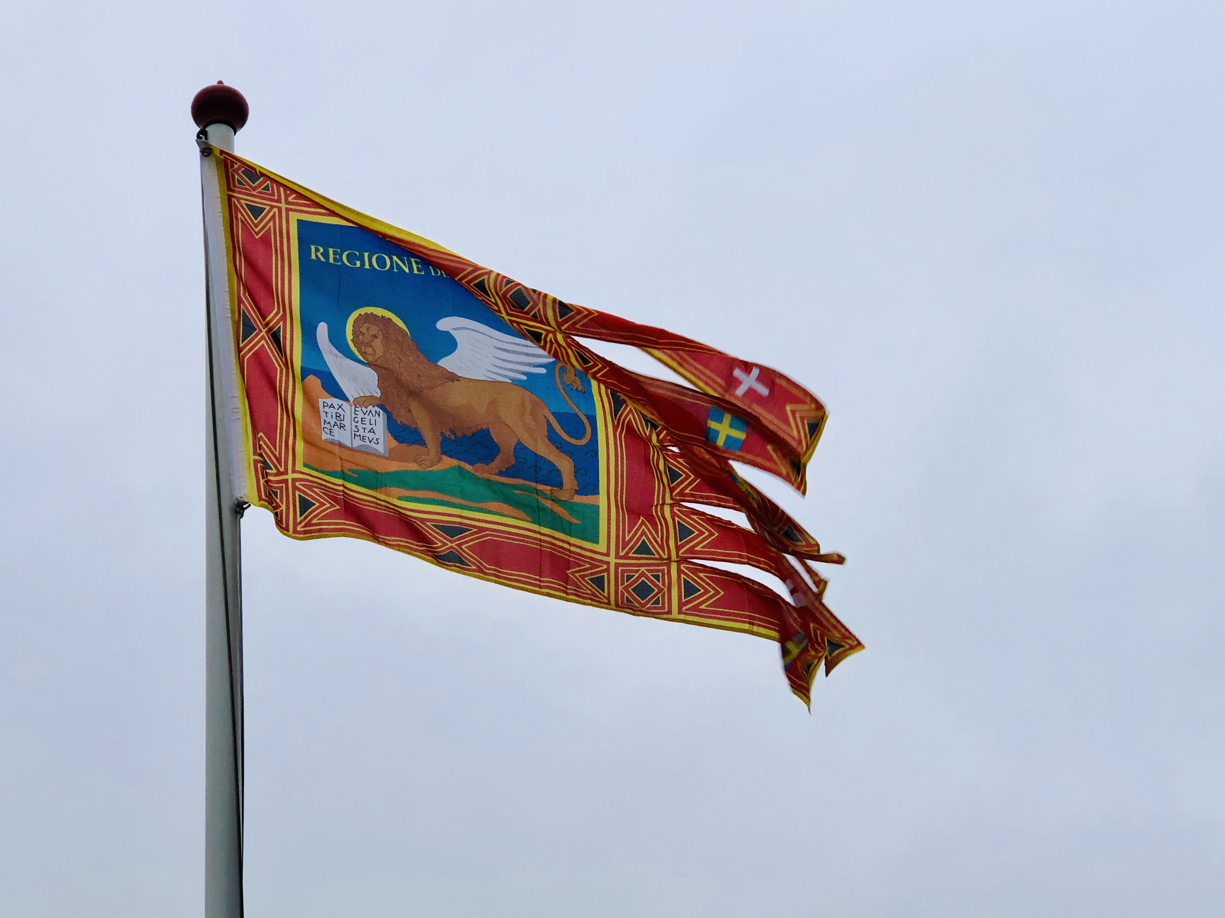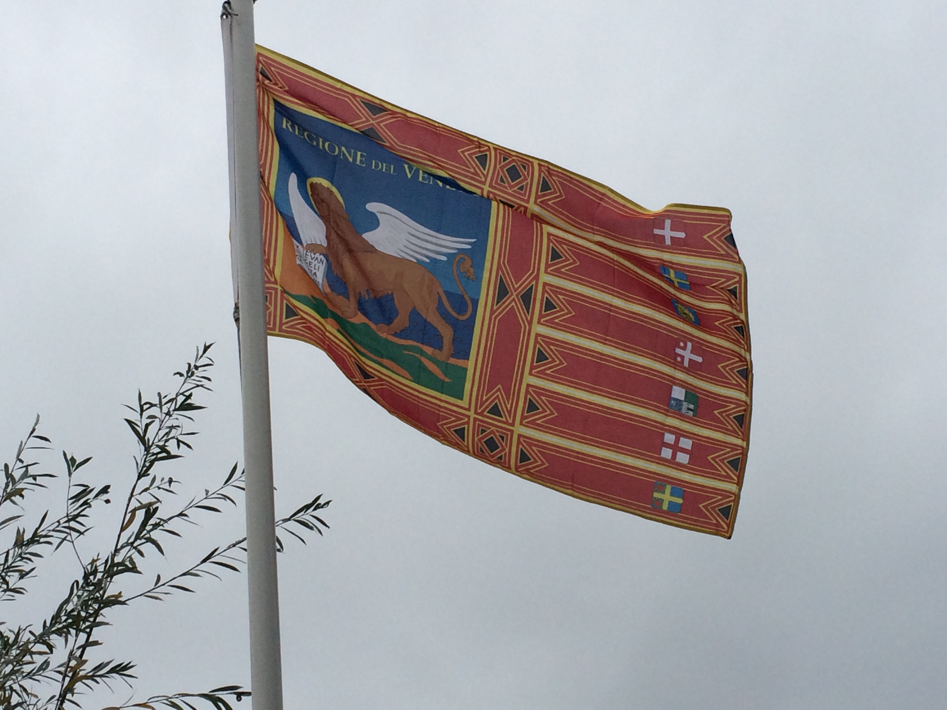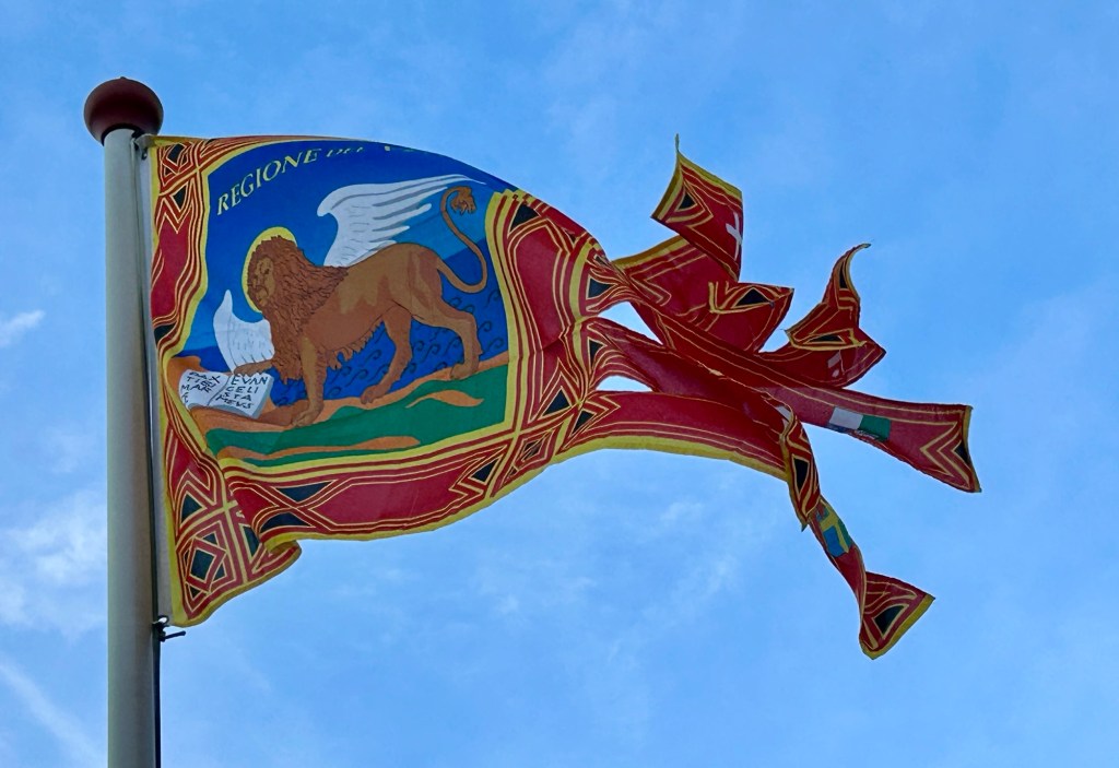 De vlag die vandaag wappert is die van de regio Veneto, waarvan Venetië de hoofdstad is. Het is een vlag waar veel op te zien is. Het borduurt voort op de vlag van de stadstaat Venetië (421-1797), als een soort 2.0.