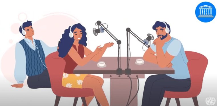 United Nations Educational, Scientific and Cultural Organization/Organisatie der Verenigde Naties voor Onderwijs, Wetenschap en Cultuur (UNESCO) – Een Griekse tempel, symbool voor wetenschap, geleerdheid en cultuur, de zes kolommen bestaan uit de letters van de organisatie.