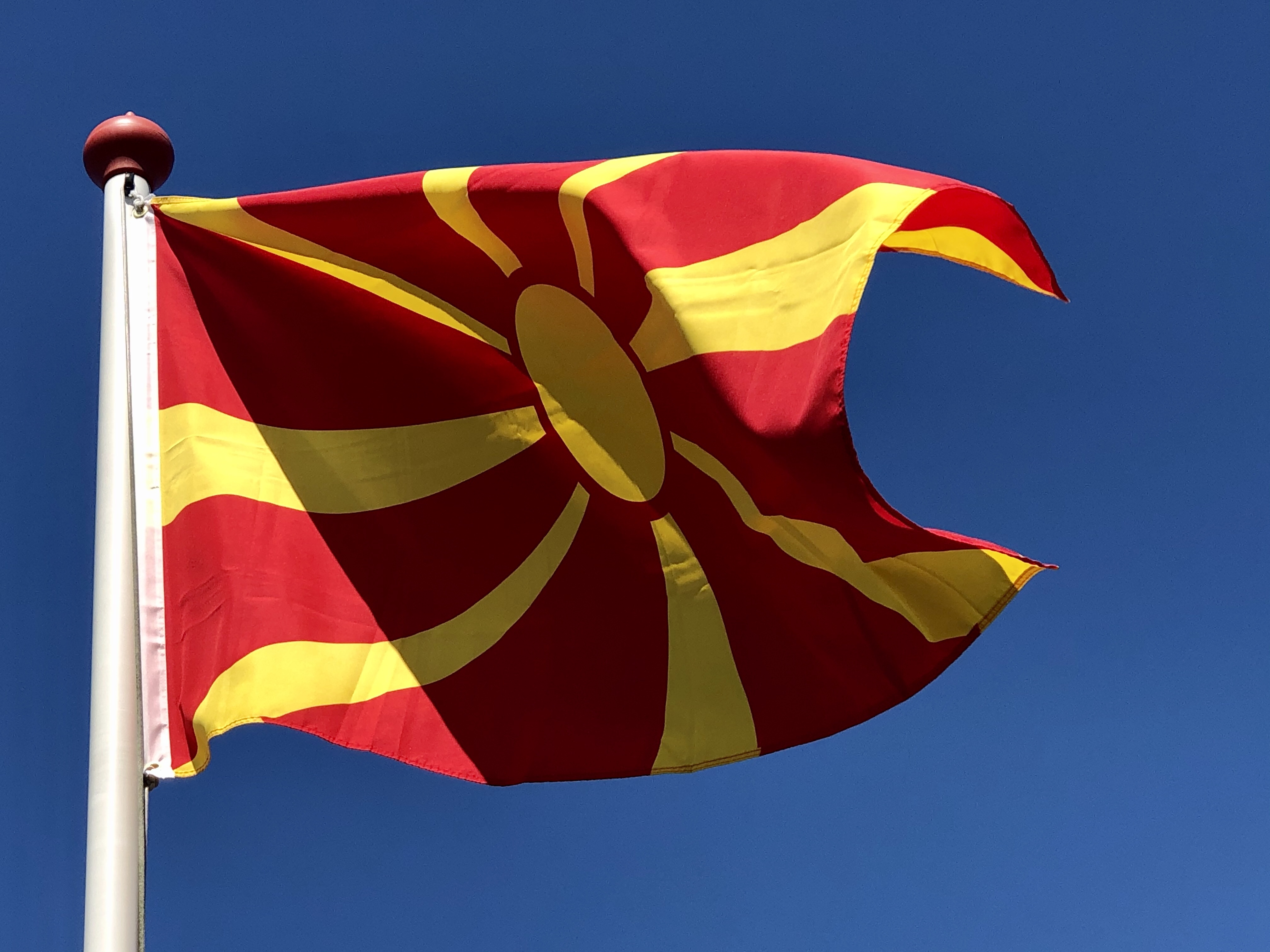 De vlag van Noord-Macedonië (toen nog Macedonië) werd op 15 juli 1992 ingevoerd en heeft een rood veld met een gestileerde gouden zon met acht lange en acht korte stralen, de zogenaamde Zon van Vergina. Dit symbool komt voor op een in 1977 gevonden gouden kistje met het gebeente van Phillipus II van Macedonië (382 v. Chr.-336 v. Chr.), de vader van Alexander de Grote. Aangezien de Zon van Vergina als symbool gezien kan worden voor de hele regio Macedonië, maakte Griekenland hier bezwaar tegen.