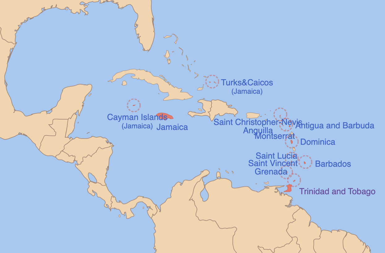 In de jaren daarna werden meerdere Caribische eilanden door Engeland geclaimd: Saint Kitts (1623), Nevis (1628), Montserrat (1632) en Antigua (1632).