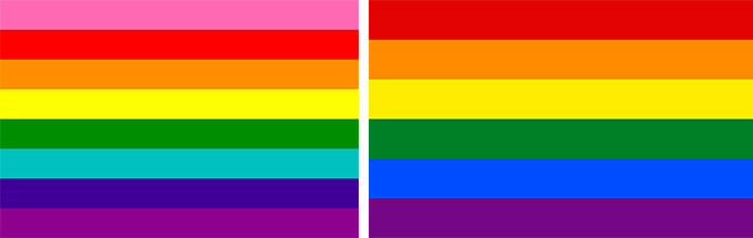 Links: De originele regenboogvlag uit 1987 / Rechts: De regenboogvlag tegenwoordig