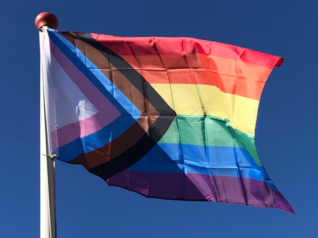 De ‘nieuwe’ kleuren verwerkte hij in de standaard regenboogvlag door ze als driehoek aan de broekingszijde toe te voegen.