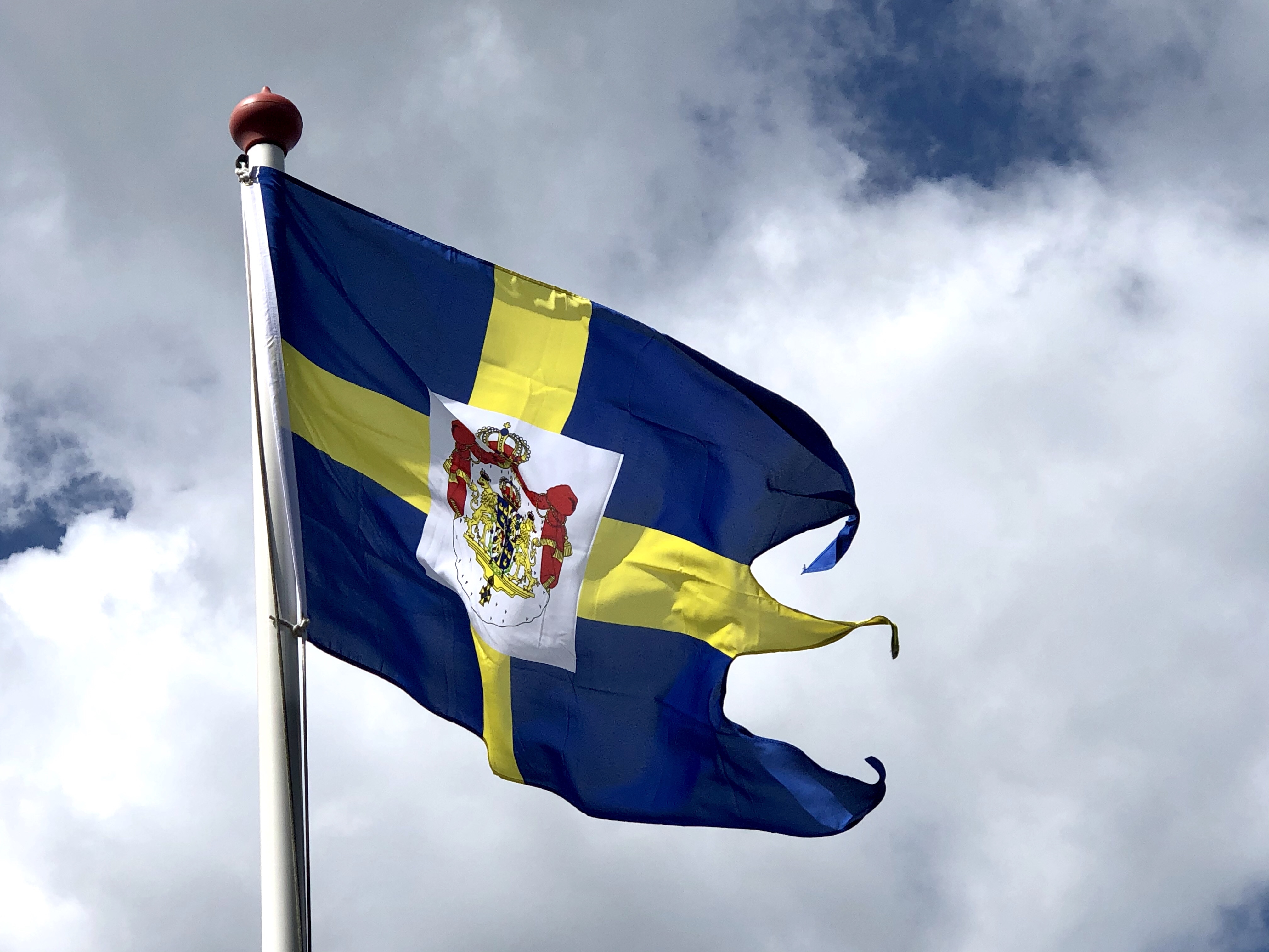 De vlag die vandaag wappert is de Zweedse koninklijke standaard. De basis voor deze vlag is de nationale vlag. De koninklijke versie is echter een bijzonder model, een zogenaamde zwaluwstaart. Aan de vluchtzijde heeft de vlag twee driehoekige uitsparingen, wat resulteert in een vlag met drie punten. Over het midden van het kruis is het groot rijkswapen afgebeeld op een wit veld. Het ‘grote’ zit hem in de plaatsing van het wapen op een gekroond baldakijn en de twee schildhouders (gekroonde leeuwen).